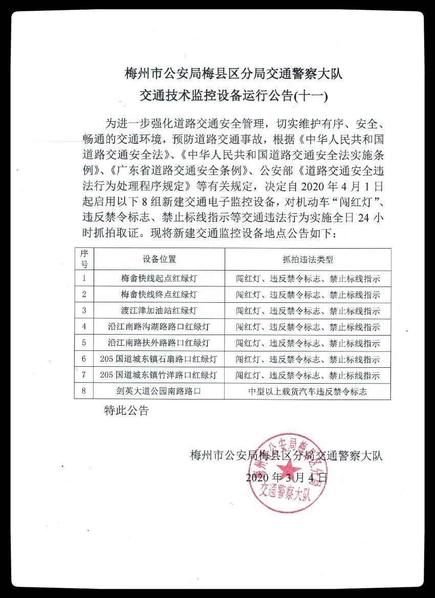 為進(jìn)一步強化道路交通安全管理,切實維護(hù)有序、安全、暢通的交通環(huán)境,預(yù)防道路交通事故,根據(jù)《中華人民共和國道路交通安全法》、《中華人民共和國道路交通安全法實施條例》、《廣東省道路交通安全條例》、公安部《道路交通安全違法行為處理程序規(guī)定》等有關(guān)規(guī)定,決定自2020年4月1日起啟用以下8組新建交通電子監(jiān)控設(shè)備,對機(jī)動車“闖紅燈”、違反禁令標(biāo)志、禁止標(biāo)線指示等交通違法行為實施全日24小時抓拍取證。現(xiàn)將新建交通監(jiān)控設(shè)備地點公告如下: