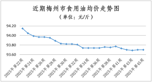 糧油價格基本穩(wěn)定。本周糧食均價為3.22元/斤,環(huán)比(與2025年第44周相比,下同)持平;食用油均價為93.70元/桶(5L),環(huán)比持平。