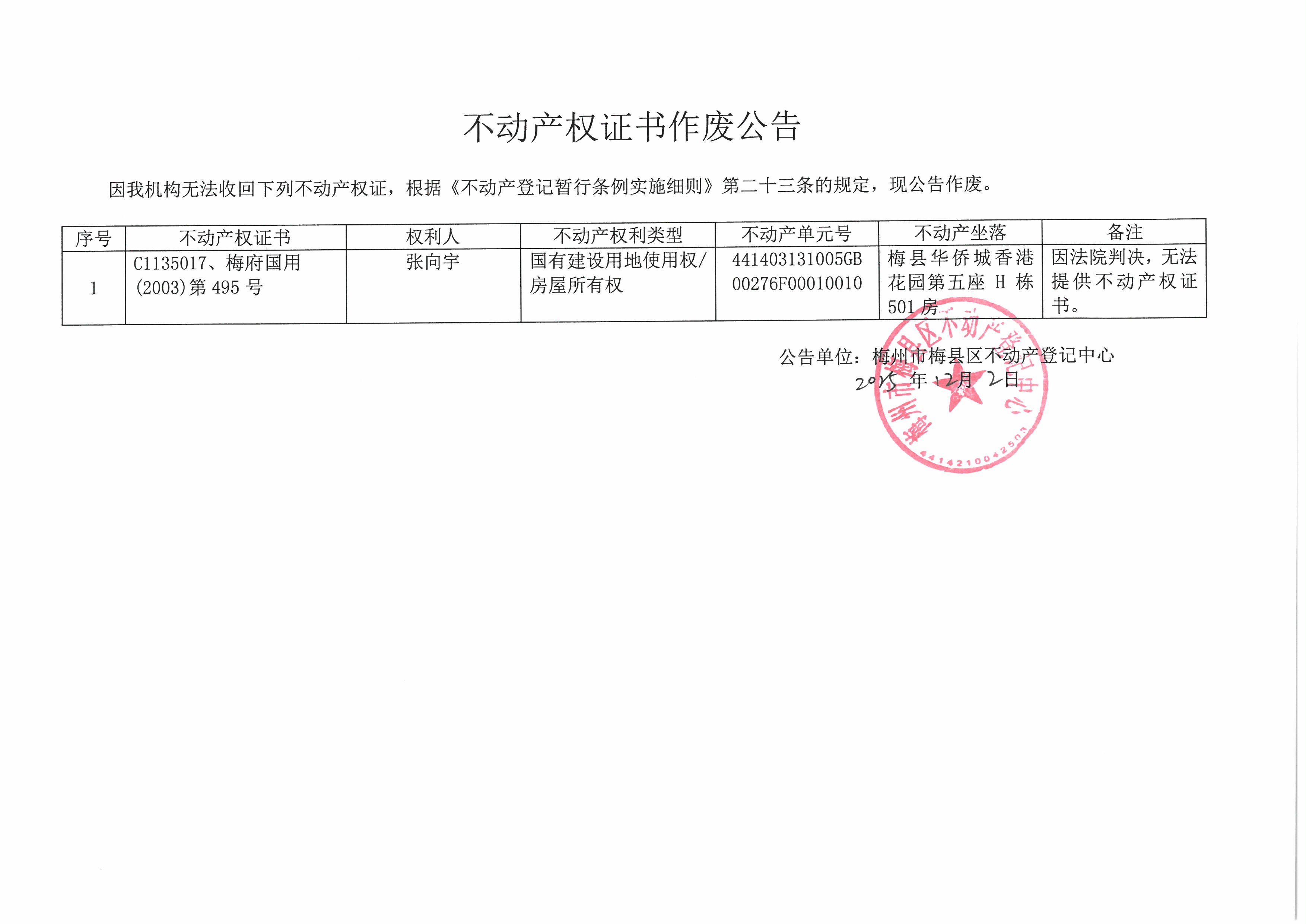 不動產登記中心登記公告(作廢公告-張向宇-C1135017、梅府國用(2003)第495號)