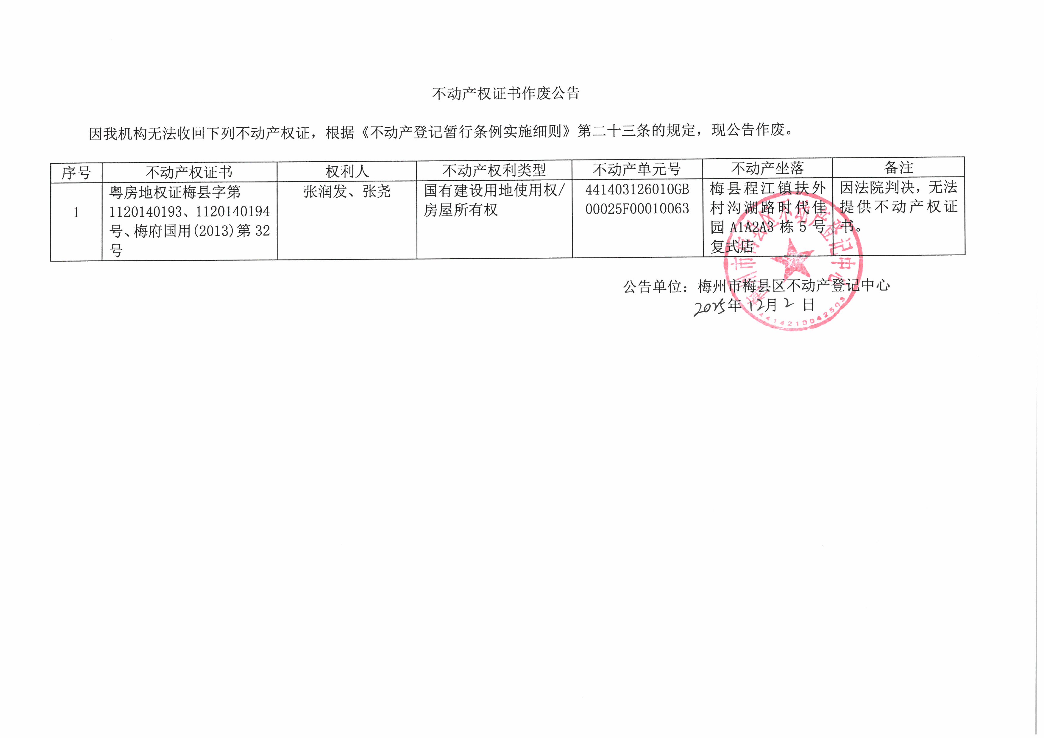 不動產登記中心登記公告(作廢公告-張潤發、張堯-粵房地權證梅縣字第1120140193、1120140194號、梅府國用(2013)第32號)