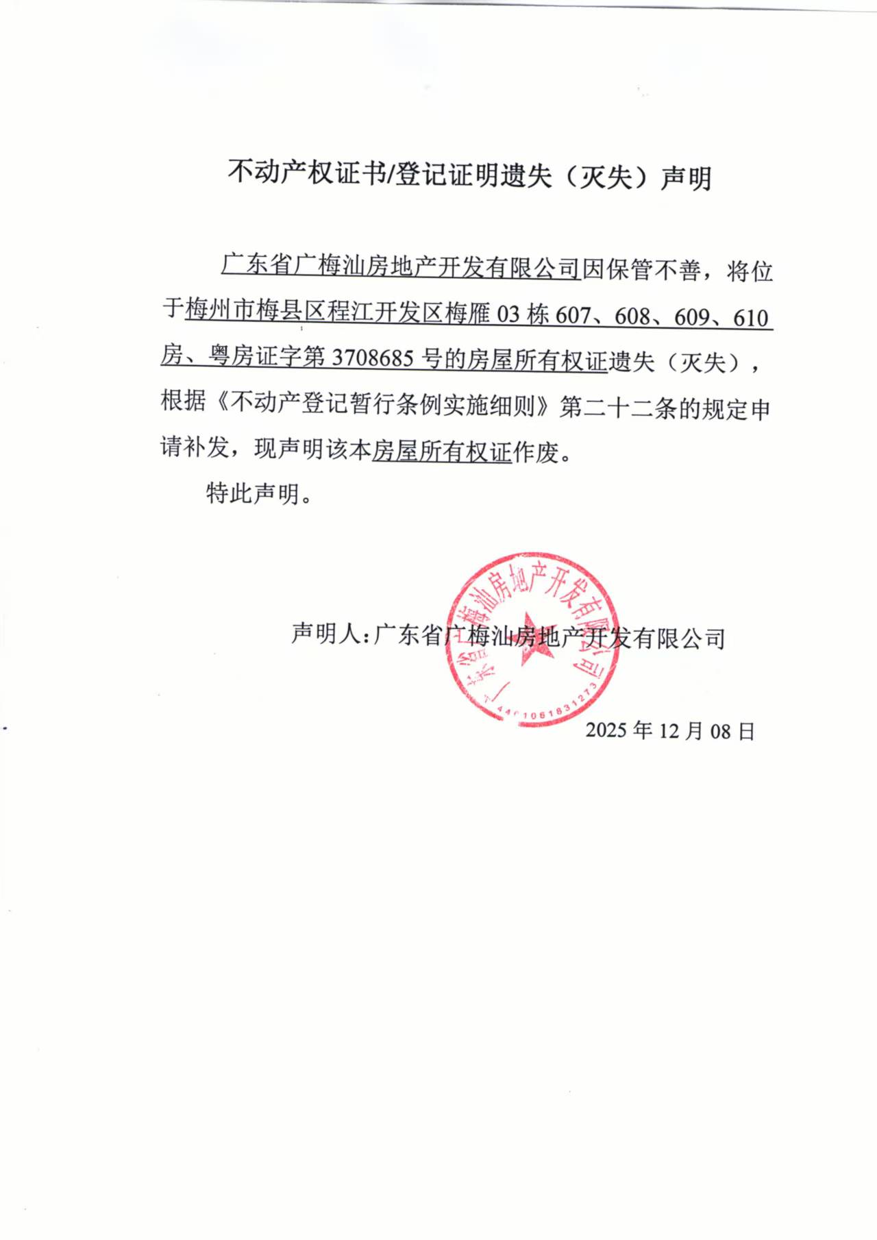 廣東省廣梅汕房地產開發有限公司因保管不善,將位于梅州市梅縣區程江開發區梅雁03棟607、608、609、610房、粵房證字第3708685號的房屋所有權證遺失(滅失)根據《不動產登記暫行條例實施細則》第二十二條的規定申請補發,現聲明該本房屋所有權證作廢。