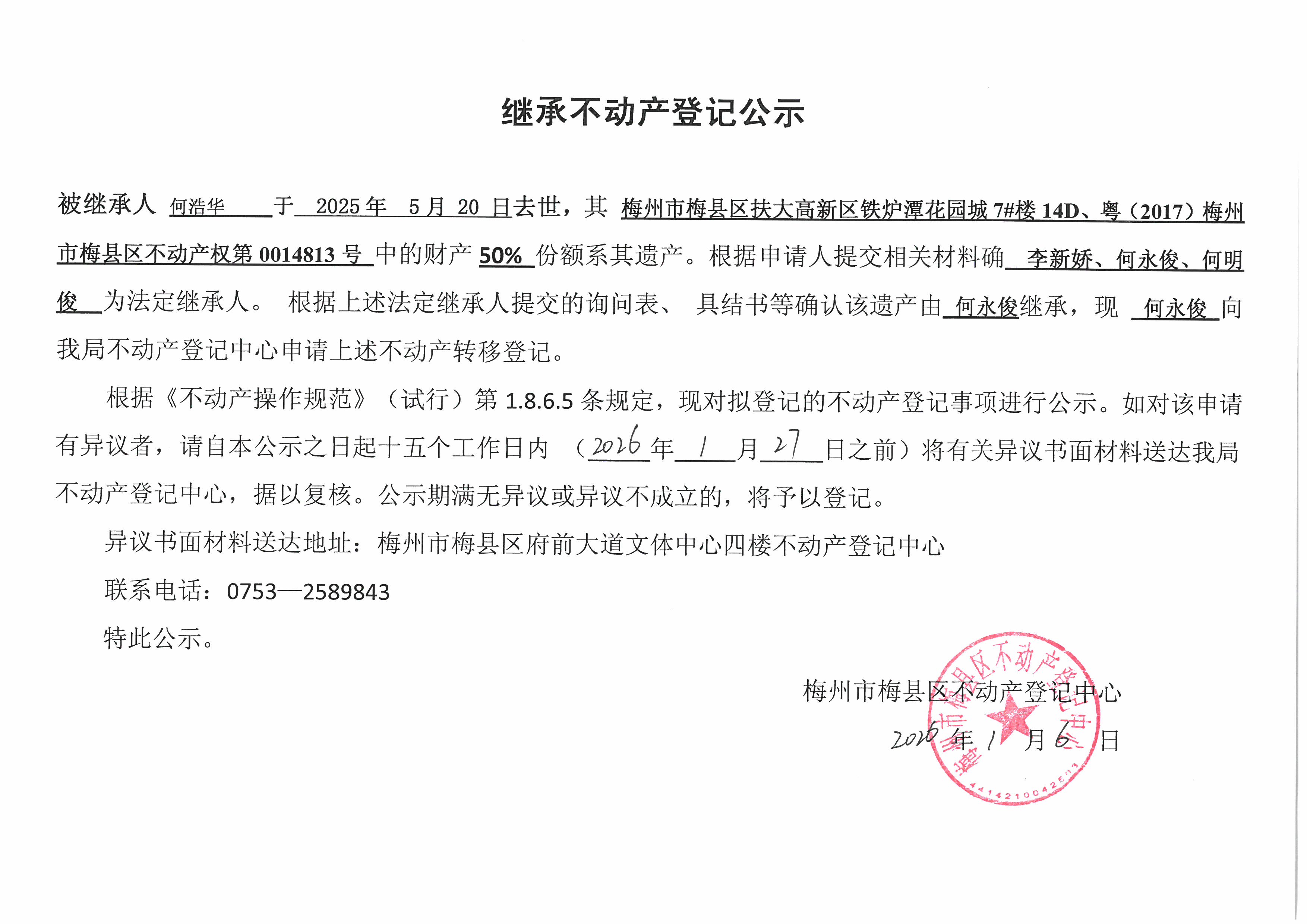 被繼承人何浩華于2025年5月20日去世,其梅州市梅縣區(qū)大高新區(qū)鐵爐潭花園城7#樓14D、粵(2017)梅州市梅縣區(qū)不動(dòng)產(chǎn)權(quán)第0014813號中的財(cái)產(chǎn)50%份額系其遺產(chǎn)。根據(jù)申請人提交相關(guān)材料確李新嬌、何永俊、何明俊為法定繼承人。根據(jù)上述法定繼承人提交的詢問表、具結(jié)書等確認(rèn)該遺產(chǎn)由何永俊繼承,現(xiàn)何永俊向我局不動(dòng)產(chǎn)登記中心申請上述不動(dòng)產(chǎn)轉(zhuǎn)移登記。