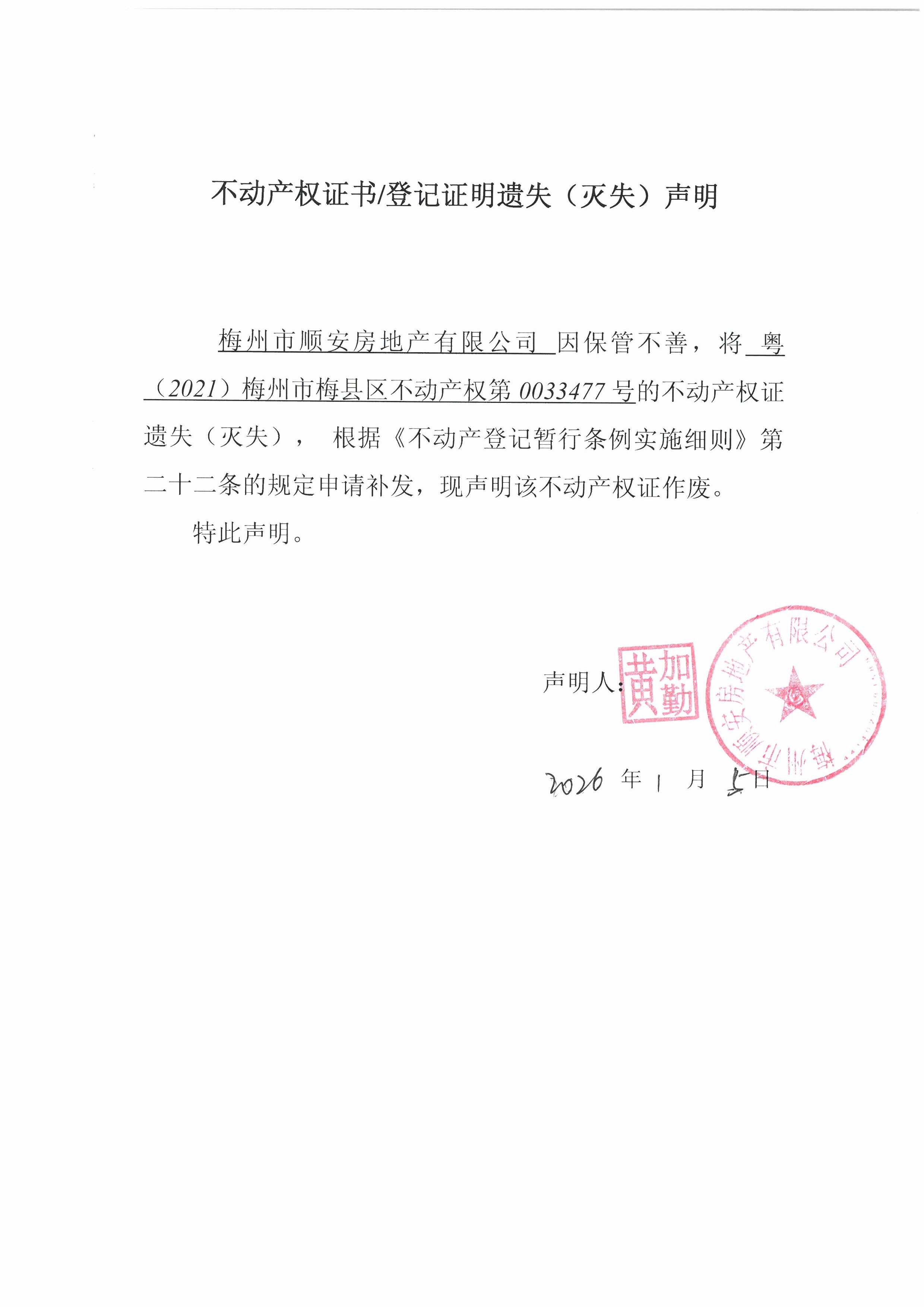 梅州市順安房地產(chǎn)有限公司因保管不善,將粵(2021)梅州市梅縣區(qū)不動(dòng)產(chǎn)權(quán)第0033477號(hào)的不動(dòng)產(chǎn)權(quán)證遺失(滅失),根據(jù)《不動(dòng)產(chǎn)登記暫行條例實(shí)施細(xì)則》第二十二條的規(guī)定申請(qǐng)補(bǔ)發(fā),現(xiàn)聲明該不動(dòng)產(chǎn)權(quán)證作廢。