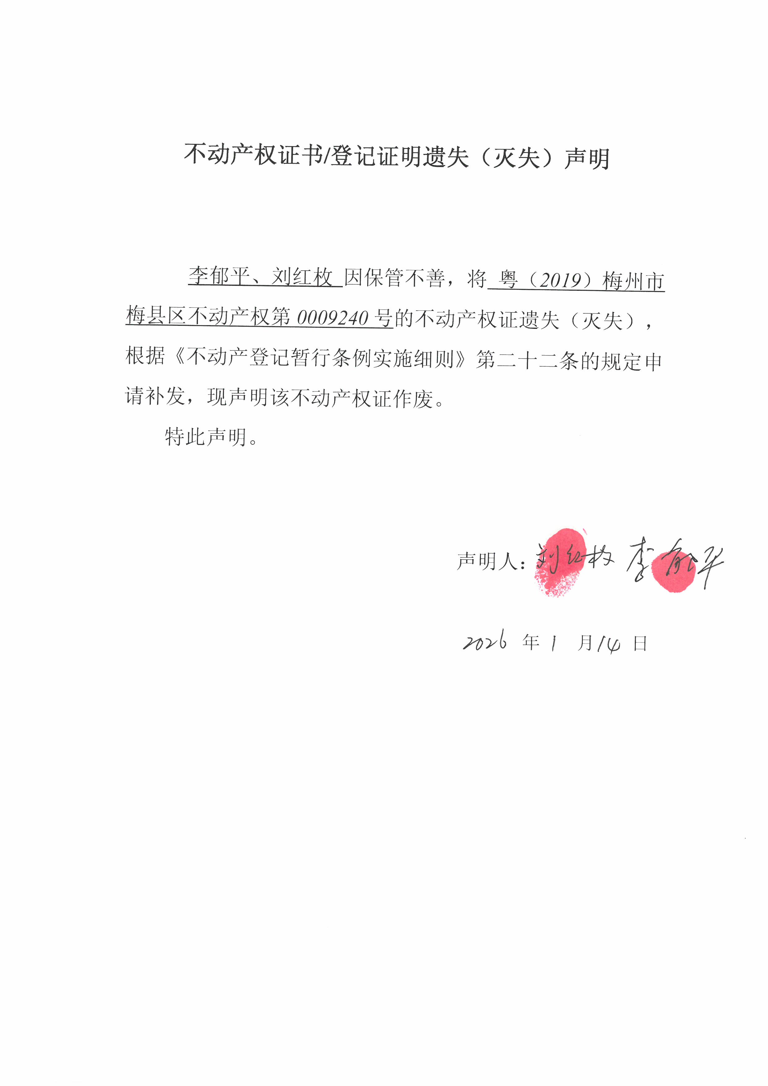 李郁平、劉紅枚因保管不善,將粵(2019)梅州市梅縣區不動產權第0009240號的不動產權證遺失(滅失)根據《不動產登記暫行條例實施細則》第二十二條的規定申請補發,現聲明該不動產權證作廢。