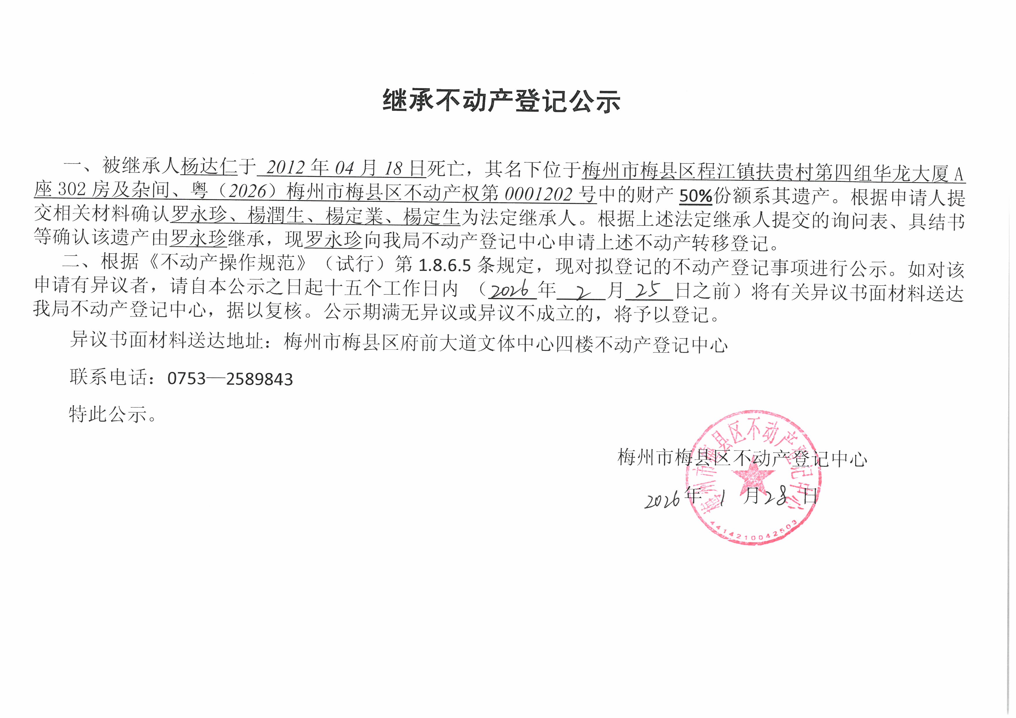 被繼承人楊達仁于2012年04月18日死亡,其名下位于梅州市梅縣區(qū)程江鎮(zhèn)扶貴村第四組華龍大廈A座302房及雜間、粵(2026)梅州市梅縣區(qū)不動產(chǎn)權(quán)第0001202號中的財產(chǎn)50%份額系其遺產(chǎn)。根據(jù)申請人提交相關(guān)材料確認羅永珍、楊潤生、楊定業(yè)、楊定生為法定繼承人。根據(jù)上述法定繼承人提交的詢問表、具結(jié)書等確認該遺產(chǎn)由羅永珍繼承,現(xiàn)羅永珍向我局不動產(chǎn)登記中心申請上述不動產(chǎn)轉(zhuǎn)移記。