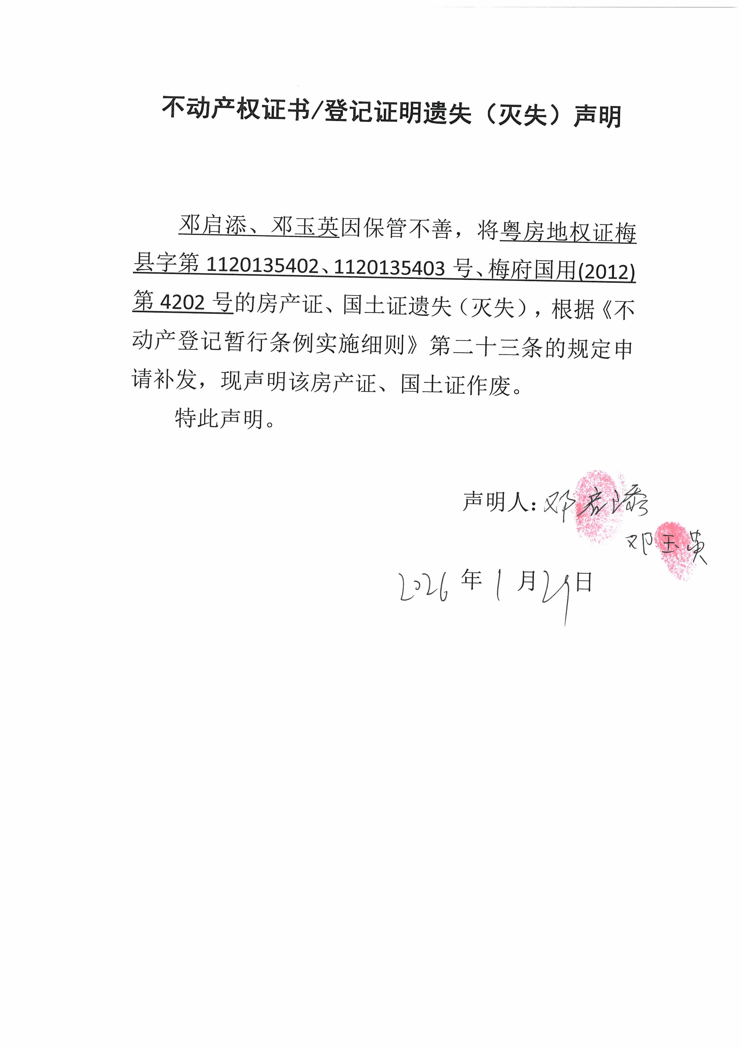 鄧啟添、鄧玉英因保管不善,將粵房地權證梅縣字第1120135402、1120135403號、梅府國用(2012)第4202號的房產證、國土證遺失(滅失),根據《不動產登記暫行條例實施細則》第二十三條的規定申請補發,現聲明該房產證、國土證作廢。特此聲明。