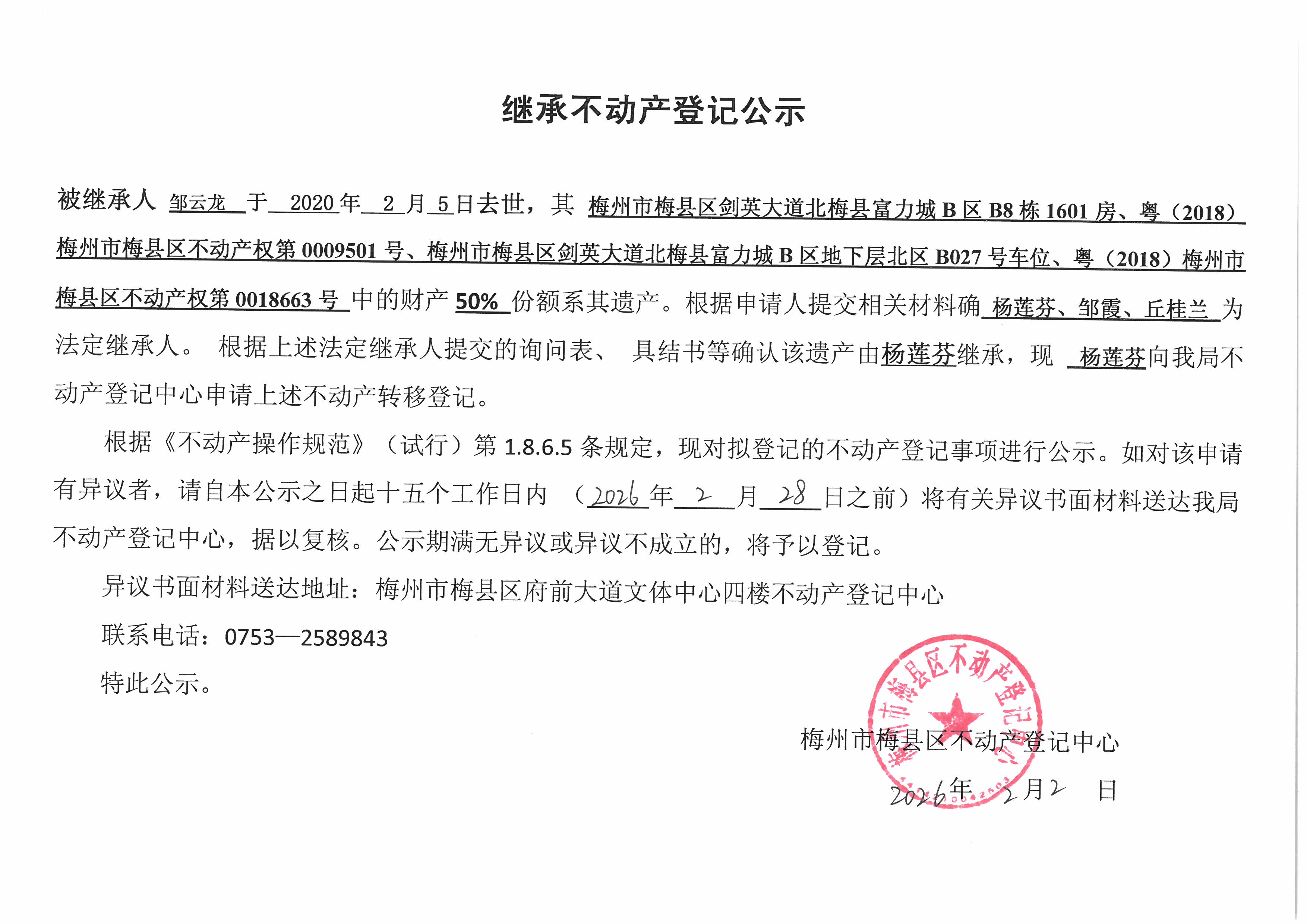 被繼承人鄒云龍于2020年2月5日去世,其梅州市梅縣區劍英大道北梅縣富力城B區B8棟1601房、粵(2018)梅州市梅縣區不動產權第0009501號、梅州市梅縣區劍英大道北梅縣富力城B區地下層北區B027號車位、粵(2018)梅州市梅縣區不動產權第0018663號中的財產50%份額系其遺產。根據申請人提交相關材料確楊蓮芬、鄒霞、丘桂蘭為法定繼承人。根據上述法定繼承人提交的詢問表、具結書等確認該遺產由楊蓮芬繼承,現楊蓮芬向我局不動產登記中心申請上述不動產轉移登記