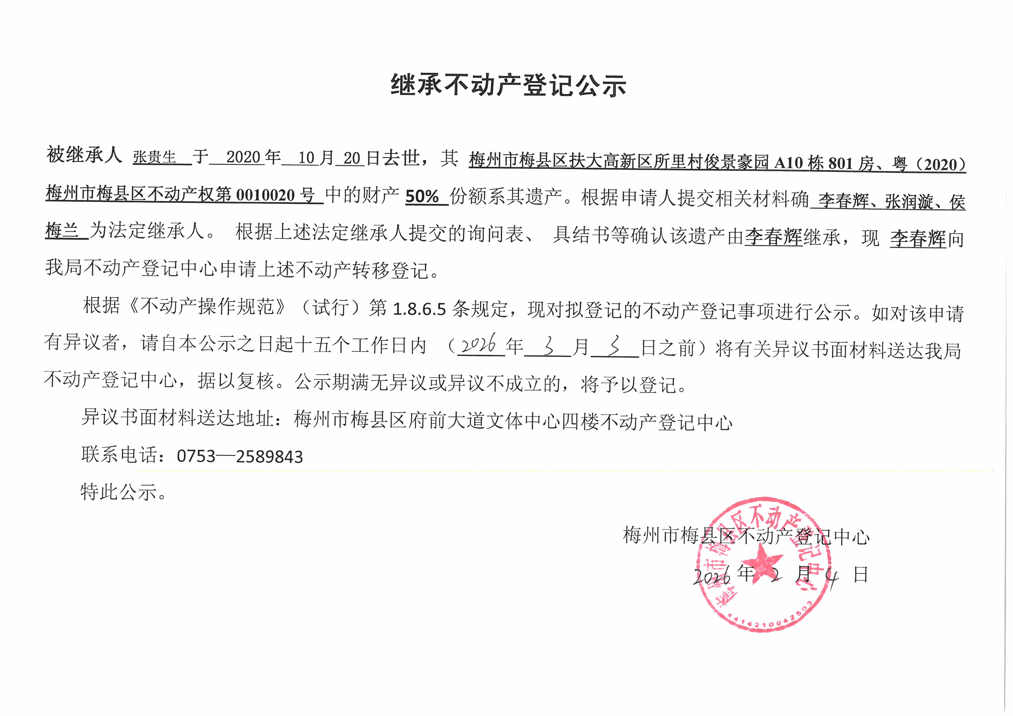 被繼承人張貴生于2020年10月20日去世,其梅州市梅縣區大高新區所里村俊景豪園A10棟801房、粵(2020)梅州市梅縣區不動產權第0010020號中的財產50%份額系其遺產。根據申請人提交相關材料確認李春輝、張潤漩、侯梅蘭為法定繼承人。根據上述法定繼承人提交的詢問表、具結書等確認該遺產由李春輝繼承,現李春輝向我局不動產登記中心申請上述不動產轉移登記。