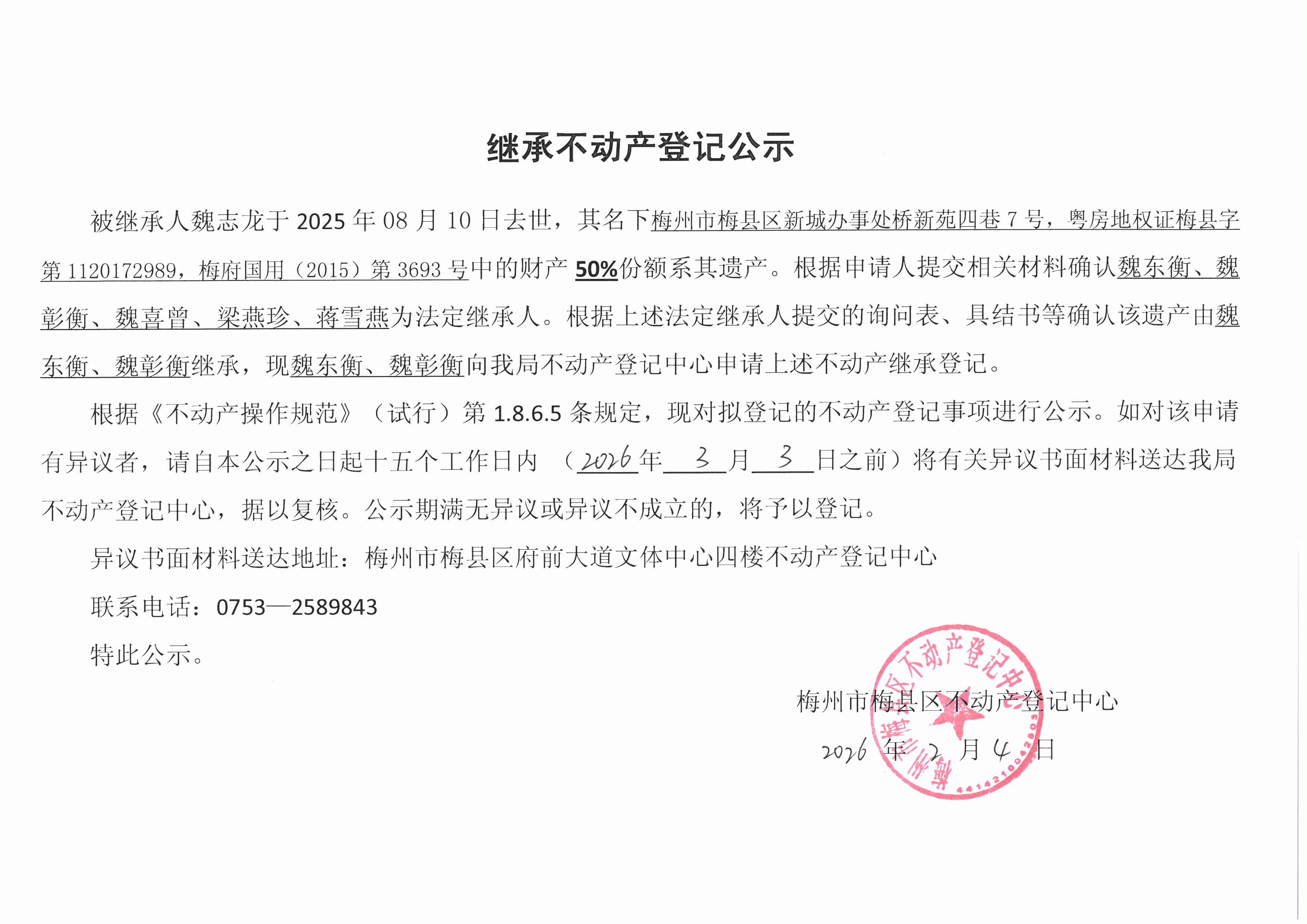 被繼承人魏志龍于2025年08月10日去世,其名下梅州市梅縣區(qū)新城辦事處橋新苑四巷7號,粵房地權(quán)證梅縣字第1120172989,梅府國用(2015)第3693號中的財產(chǎn)50%份額系其遺產(chǎn)。根據(jù)中請人提交相關(guān)材料確認(rèn)魏東衡、魏彰衡、魏喜曾、梁燕珍、蔣雪燕為法定繼承人。根據(jù)上述法定繼承人提交的詢問表、具結(jié)書等確認(rèn)該遺產(chǎn)由魏東衡、魏彰衡繼承,現(xiàn)魏東衡、魏彰衡向我局不動產(chǎn)登記中心申請上述不動產(chǎn)繼承登記。