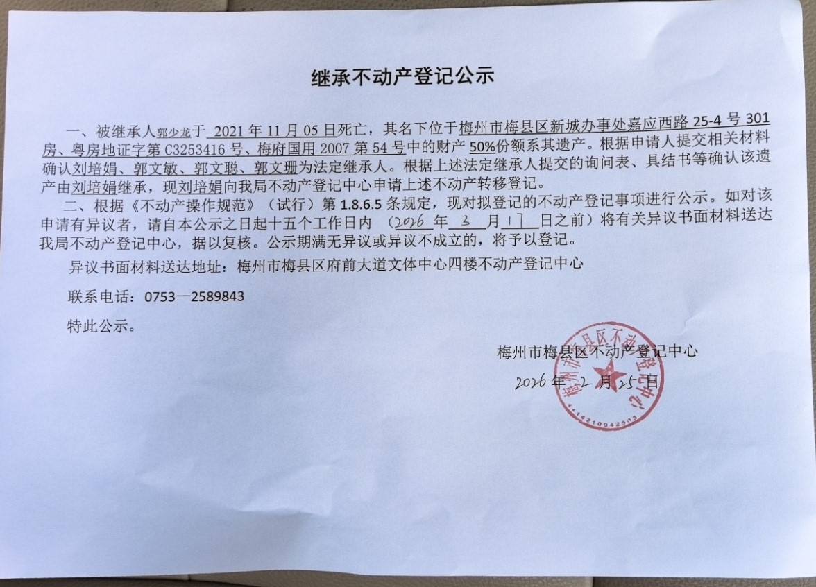 被繼承人郭少龍于2021年11月05日死亡,其名下位于梅州市梅縣區(qū)新城辦事處嘉應(yīng)西路25-4號(hào)301房、粵房地證字第C3253416號(hào)、梅府國用2007第54號(hào)中的財(cái)產(chǎn)50%份額系其遺產(chǎn)。根據(jù)申請(qǐng)人提交相關(guān)材料確認(rèn)劉培娟、郭文敏、郭文聰、郭文珊為法定繼承人。根據(jù)上述法定繼承人提交的詢問表、具結(jié)書等確認(rèn)該遺產(chǎn)由劉培娟繼承,現(xiàn)劉培娟向我局不動(dòng)產(chǎn)登記中心申請(qǐng)上述不動(dòng)產(chǎn)轉(zhuǎn)移登記。