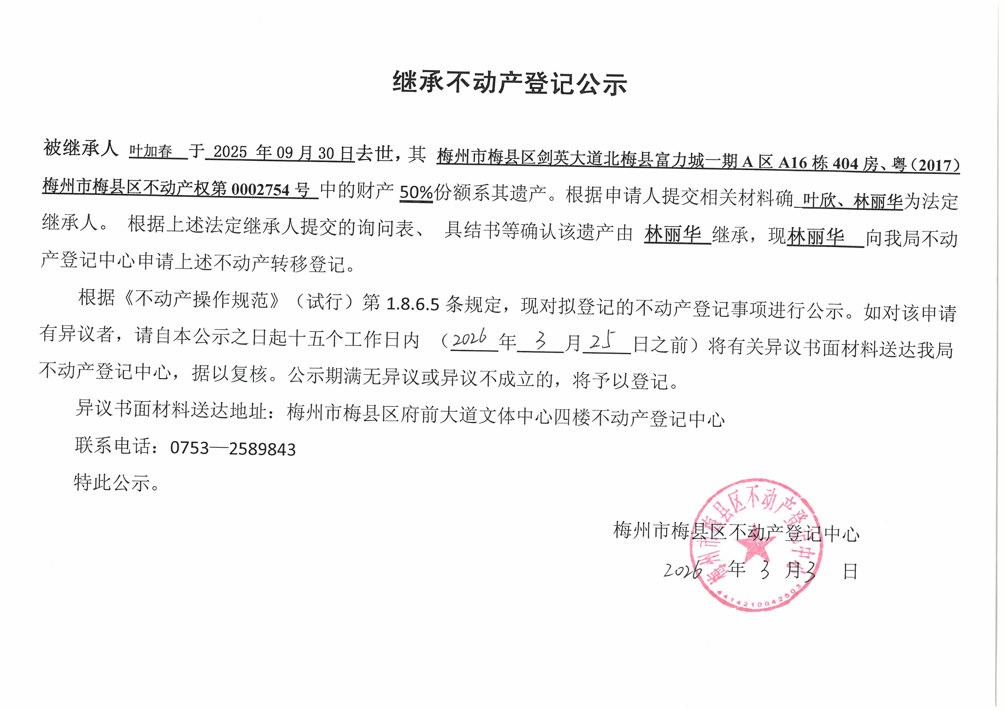 被繼承人葉加春于2025年09月30日去世,其梅州市梅縣區(qū)劍英大道北梅縣富力城一期A區(qū)A16棟404房、粵(2017)梅州市梅縣區(qū)不動產(chǎn)權(quán)第0002754號中的財產(chǎn)50%份額系其遺產(chǎn)。根據(jù)申請人提交相關(guān)材料確認葉欣、林麗華為法定繼承人。根據(jù)上述法定繼承人提交的詢問表、具結(jié)書等確認該遺產(chǎn)由林麗華繼承,現(xiàn)林麗華向我局不動產(chǎn)登記中心申請上述不動產(chǎn)轉(zhuǎn)移登記。