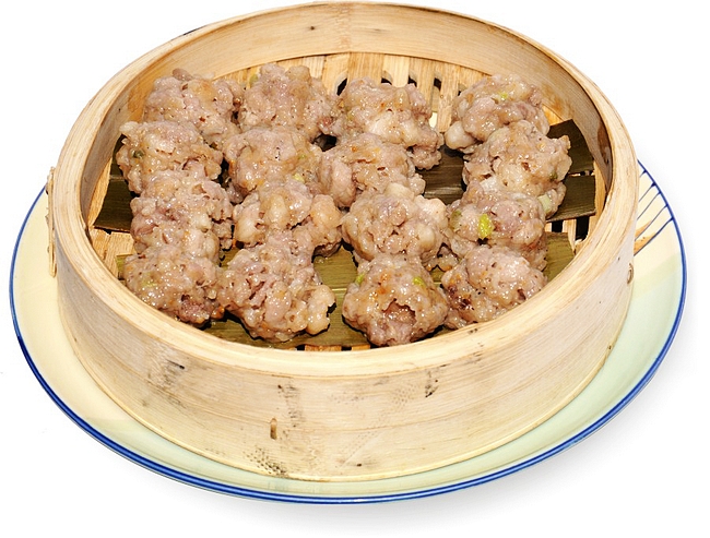 先將新鮮剛宰鬃頭瘦肉切成小條狀,干蝦米用水浸泡軟洗凈,吸干水分,拌入切好瘦肉中,加入干薯粉,調(diào)入味料,拌勻擠成小圓狀,放入盤中,放入蒸籠用猛火蒸約10分鐘剛熟出鍋即成。