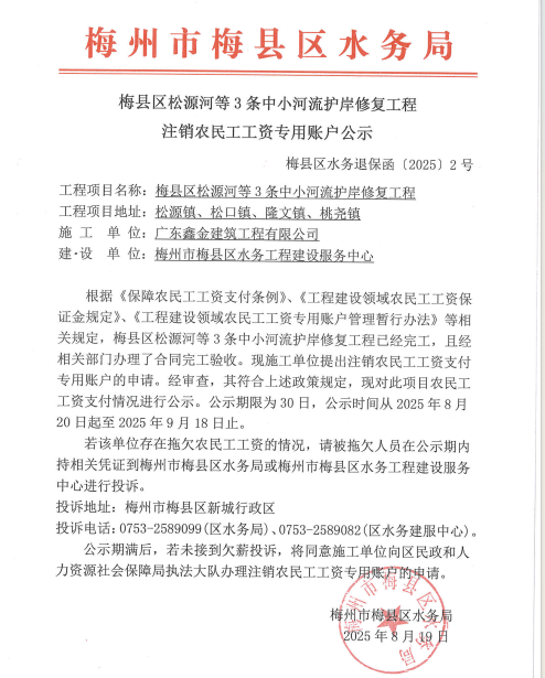 梅縣區松源河等3條中小河流護岸修復工程注銷農民工工資專用賬戶公示