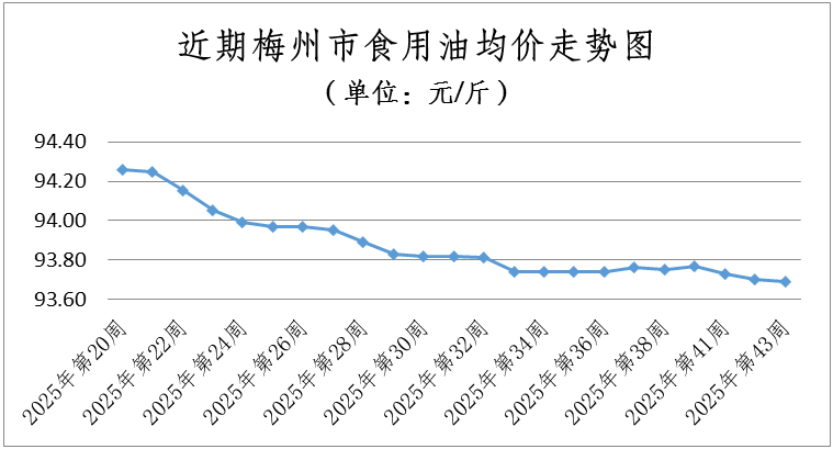糧油價(jià)格基本穩(wěn)定。本周糧食均價(jià)為3.22元/斤,環(huán)比(與2025年第42周相比,下同)持平;食用油均價(jià)為93.69元/桶(5L),環(huán)比微降0.01%。