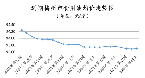糧油價(jià)格基本穩(wěn)定。本周糧食均價(jià)為3.22元/斤,環(huán)比(與2025年第43周相比,下同)持平;食用油均價(jià)為93.70元/桶(5L),環(huán)比微升0.01%。