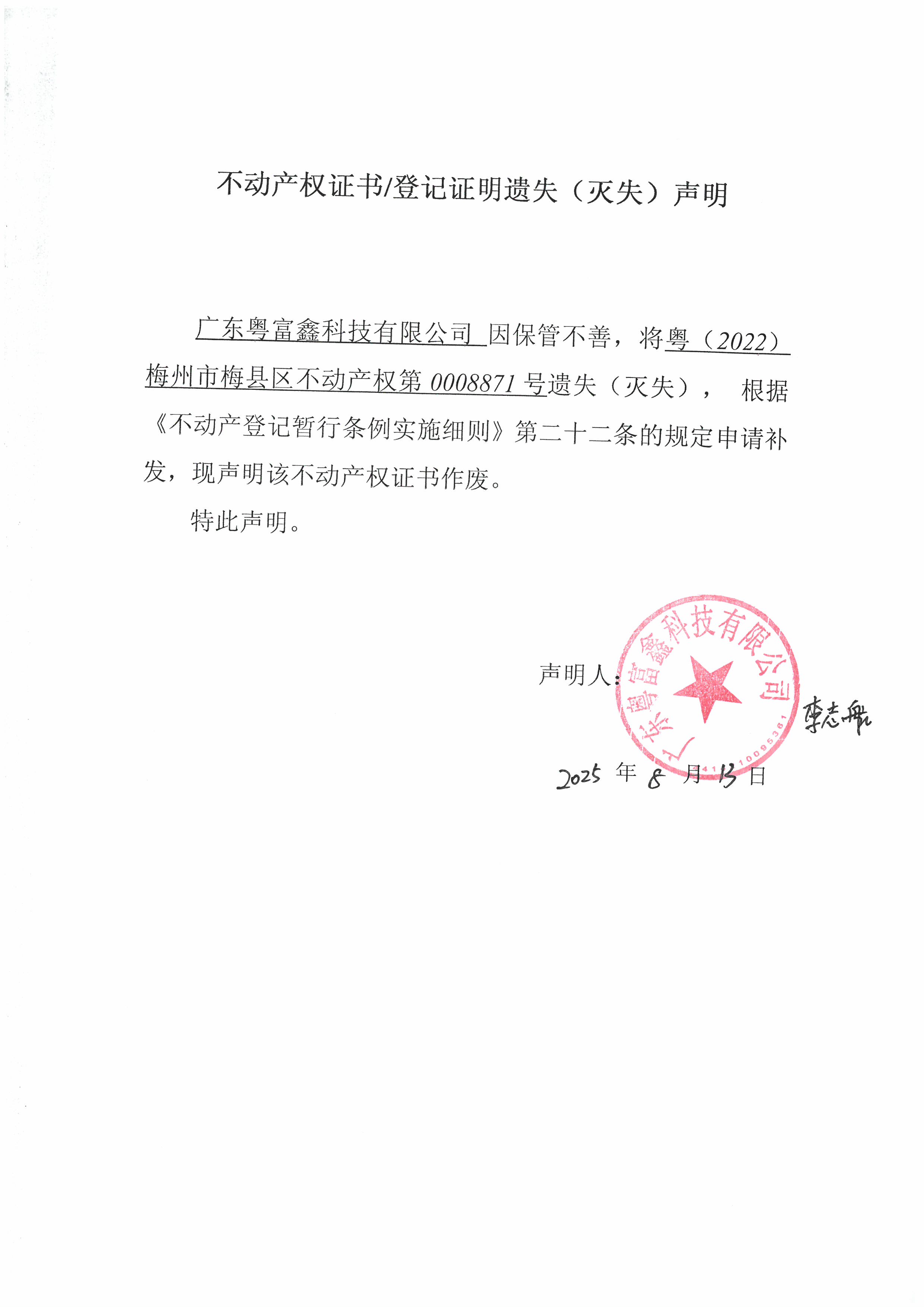 廣東粵富鑫科技有限公司 因保管不善,將粵(2022)梅州市梅縣區不動產權第0008871號遺失(滅失),根據《不動產登記暫行條例實施細則》第二十二條的規定申請補發,現聲明該不動產權證書作廢。