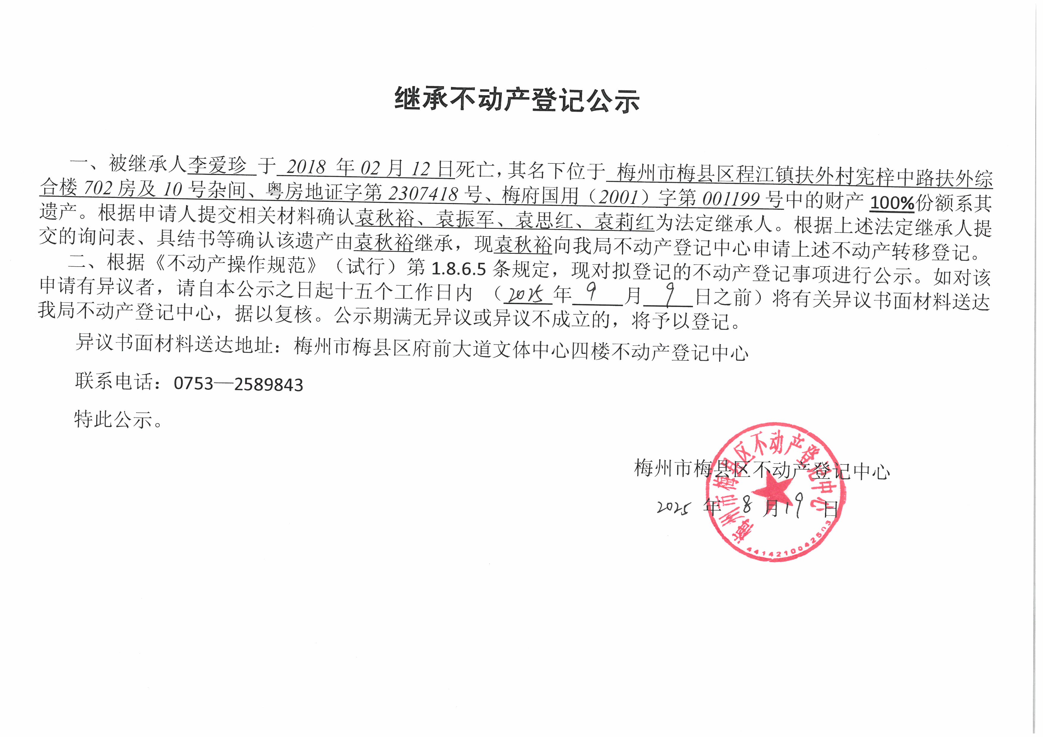 被繼承人李愛珍于2018年02月12日死亡,其名下位于梅州市梅縣區(qū)程江鎮(zhèn)扶外村憲梓中路扶外綜合樓702房及10號(hào)雜間、粵房地證字第2307418號(hào)、梅府國(guó)用(2001)字第001199號(hào)中的財(cái)產(chǎn)100%份額系其遺產(chǎn)。根據(jù)申請(qǐng)人提交相關(guān)材料確認(rèn)袁秋裕、袁振軍、袁思紅、袁莉紅為法定繼承人。根據(jù)上述法定繼承人提交的詢問表、具結(jié)書等確認(rèn)該遺產(chǎn)由袁秋裕繼承,現(xiàn)袁秋裕向我局不動(dòng)產(chǎn)登記中心申請(qǐng)上述不動(dòng)產(chǎn)轉(zhuǎn)移登記。