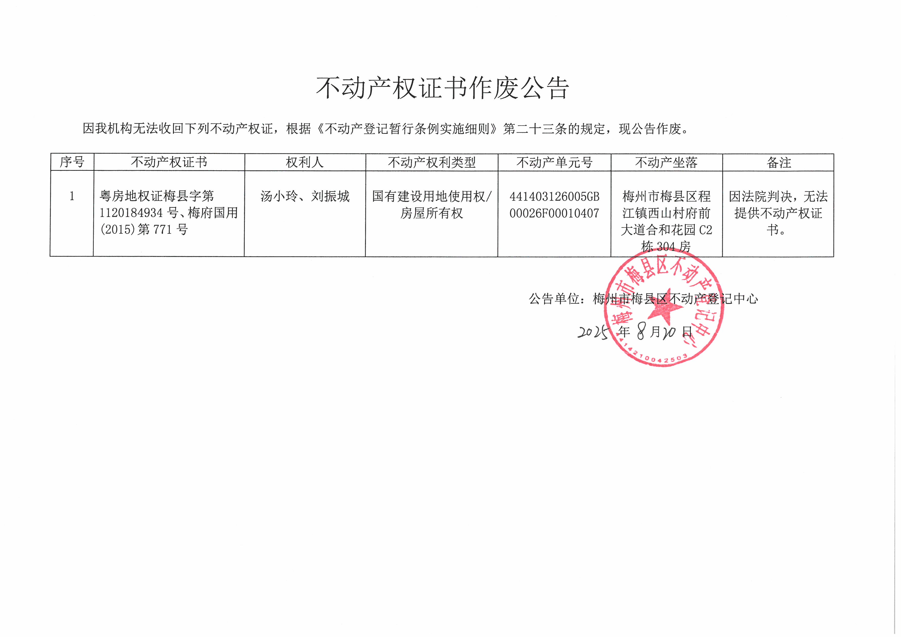 不動產登記中心登記公告(作廢公告-湯小玲、劉振城-粵房地權證梅縣字第1120184934號、梅府國用(2015)第771號)