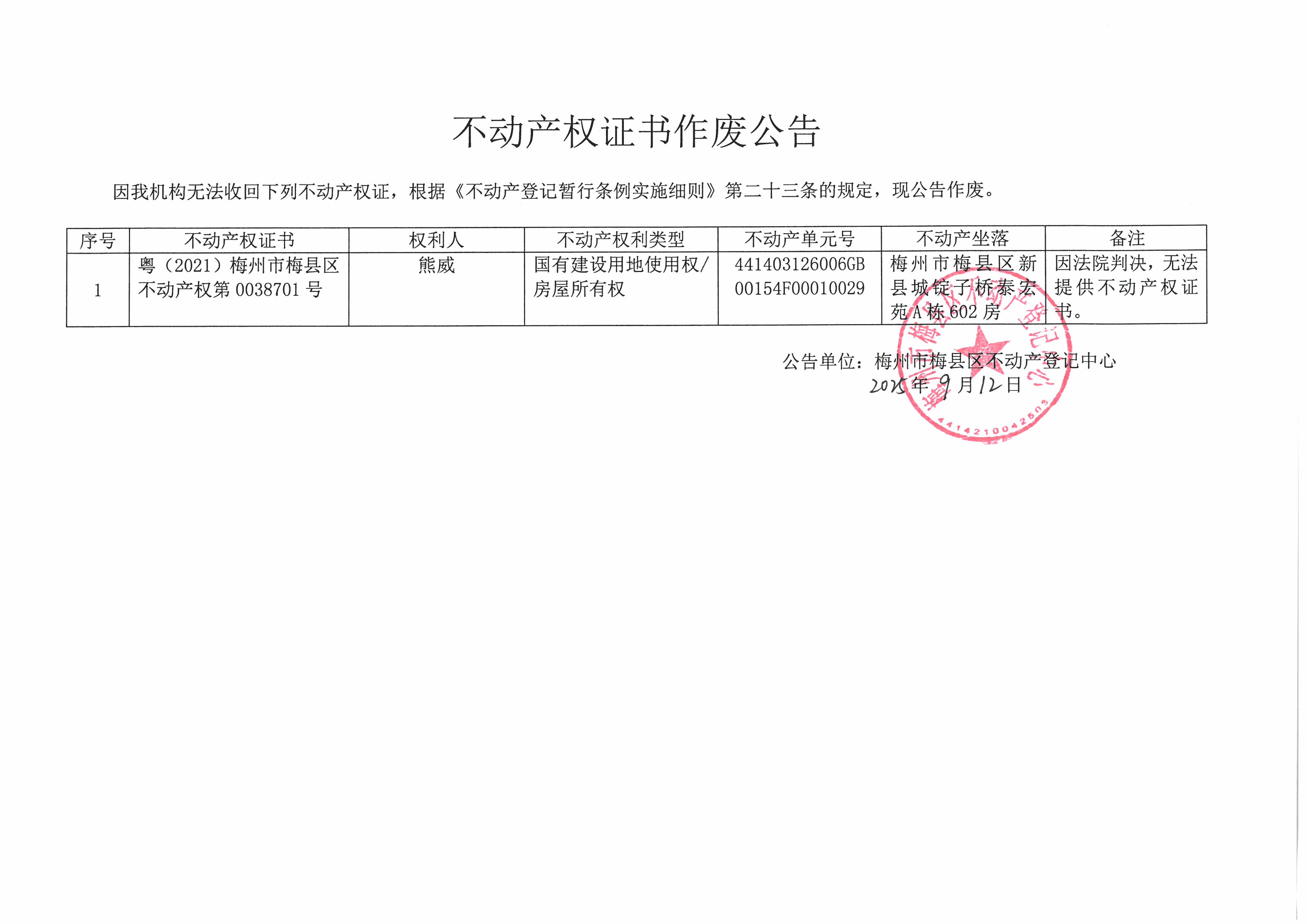 不動產登記中心登記公告(作廢公告-熊威-粵(2021)梅州市梅縣區不動產權第0038701號)