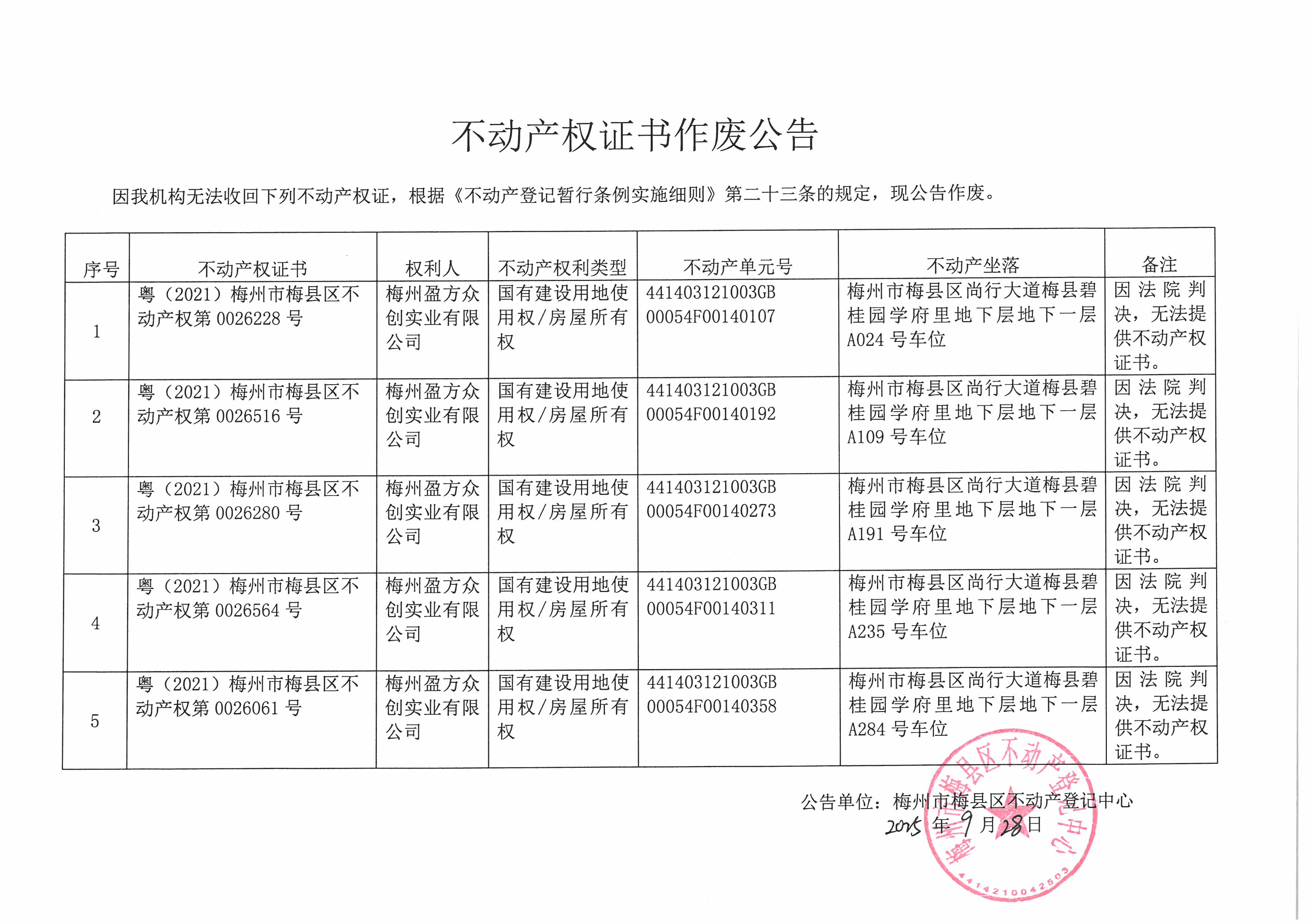 4 | 粵(2021)梅州市梅縣區不動產權第0026564號 | 梅州盈方眾創實業有限公司 | 國有建設用地使用權/房屋所有權 | 441403121003GB 00054F00140311 | 梅州市梅縣區尚行大道梅縣碧桂園學府里地下層地下一層A235號車位 | 因法院判決,無法提供不動產權證書。 |