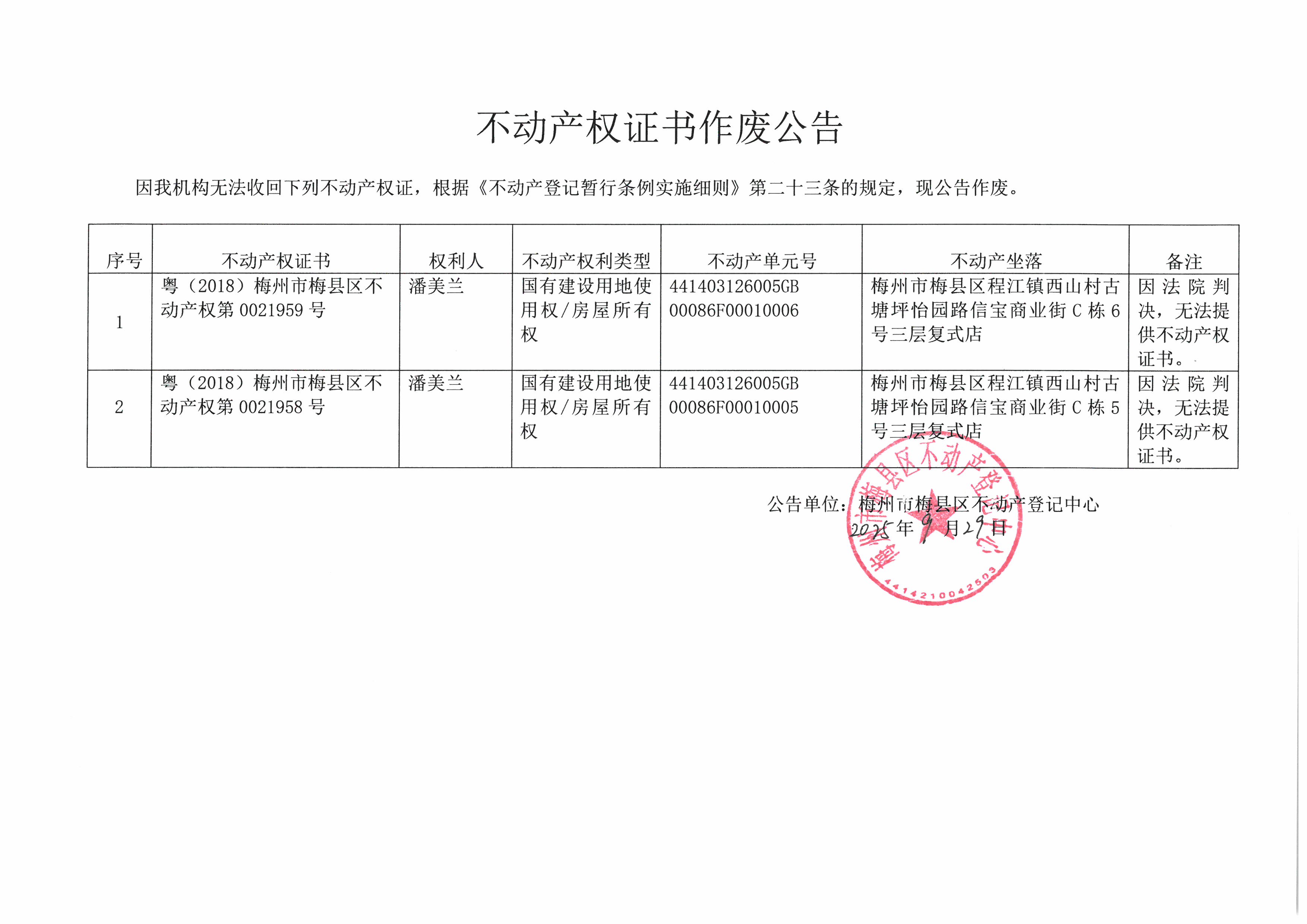 不動產登記中心登記公告(作廢公告-潘美蘭-粵(2018)梅州市梅縣區不動產權第0021959號、粵(2018)梅州市梅縣區不動產權第0021958號)