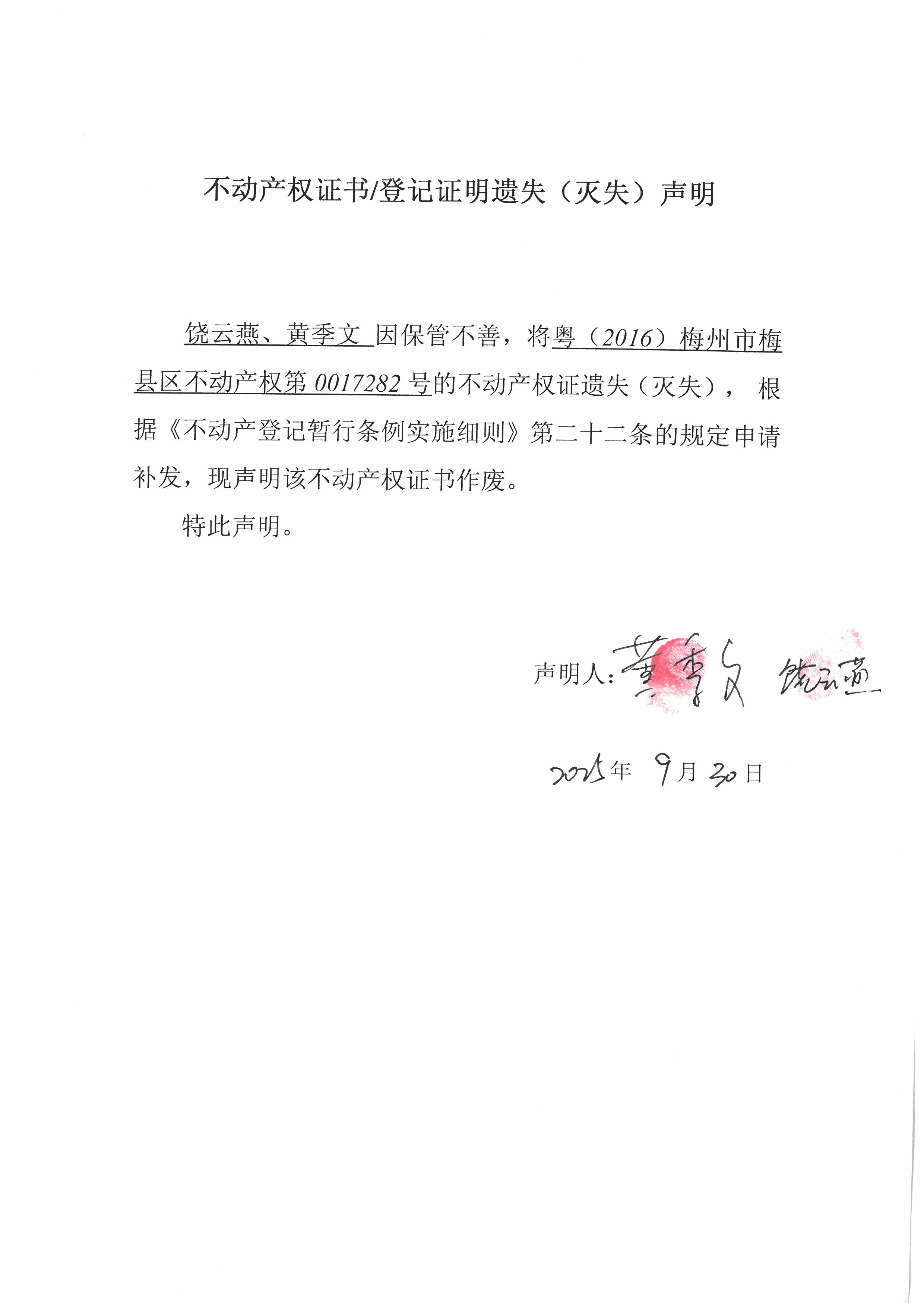饒云燕、黃季文因保管不善,將粵(2016)梅州市梅縣區不動產權第0017282號的不動產權證遺失(滅失),根據《不動產登記暫行條例實施細則》第二十二條的規定申請補發,現聲明該不動產權證書作廢。