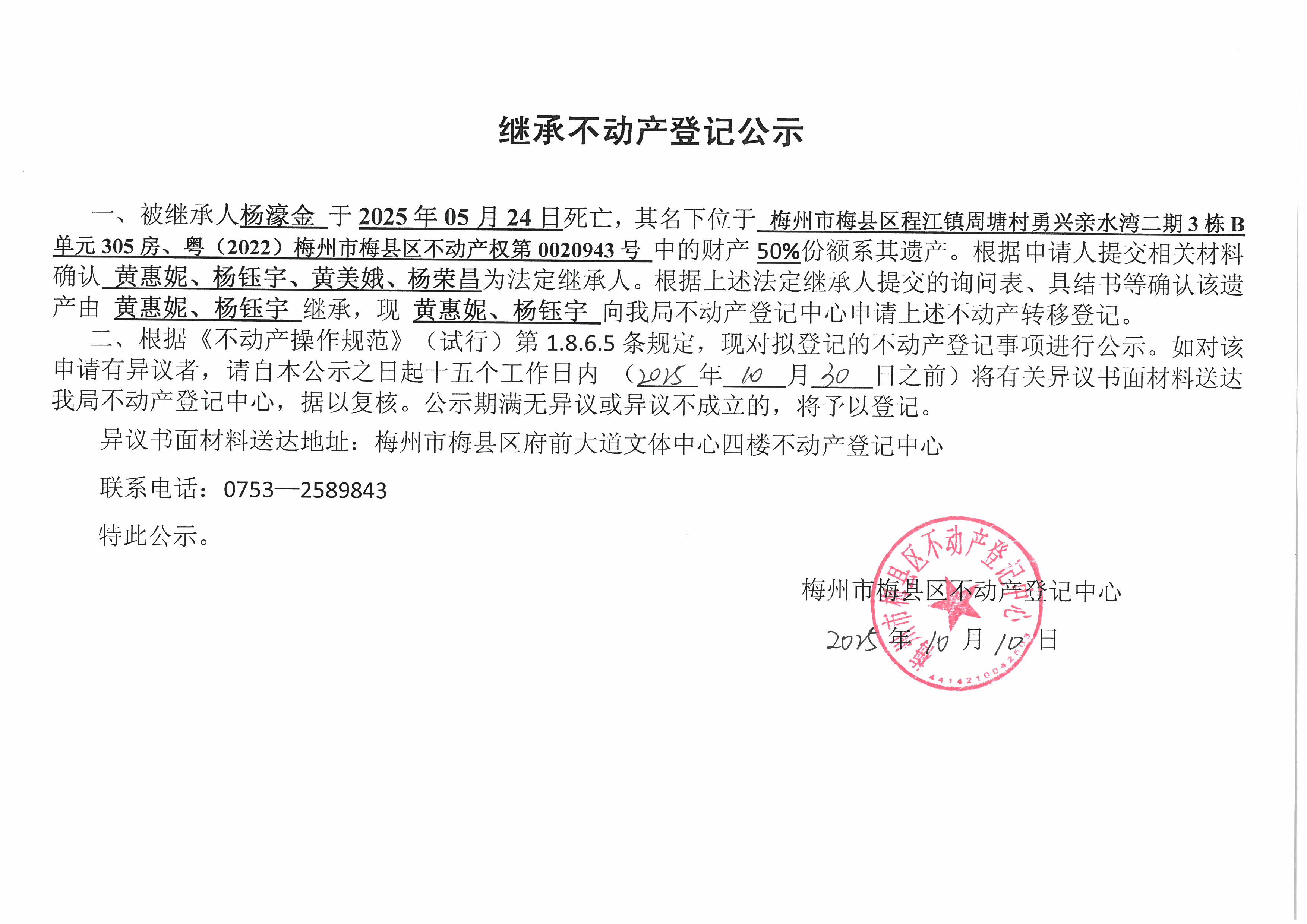 被繼承人楊濠金于2025年05月24日死亡,其名下位于梅州市梅縣區程江鎮周塘村勇興親水灣二期3棟B單元305房、粵(2022)梅州市梅縣區不動產權第0020943號中的財產50%份額系其遺產。根據申請人提交相關材料確認黃惠妮、楊鈺宇、黃美娥、楊榮昌為法定繼承人。根據上述法定繼承人提交的詢問表、具結書等確認該遺產由黃惠妮、楊鈺宇繼承,現黃惠妮、楊鈺宇向我局不動產登記中心申請上述不動產轉移登記。