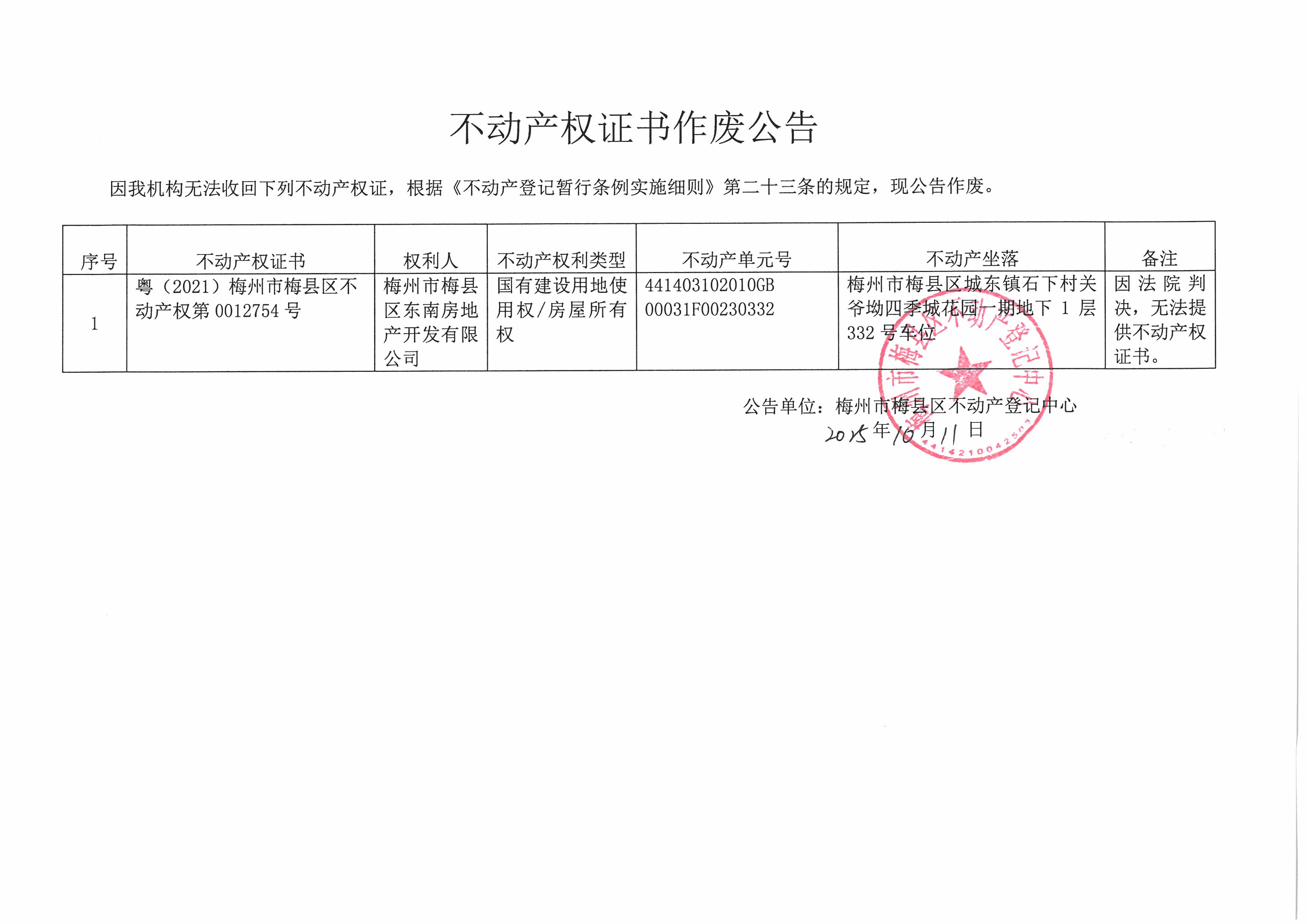 不動產登記中心登記公告(作廢公告-梅州市梅縣區東南房地產開發有限公司-粵(2021)梅州市梅縣區不動產權第0012754號)