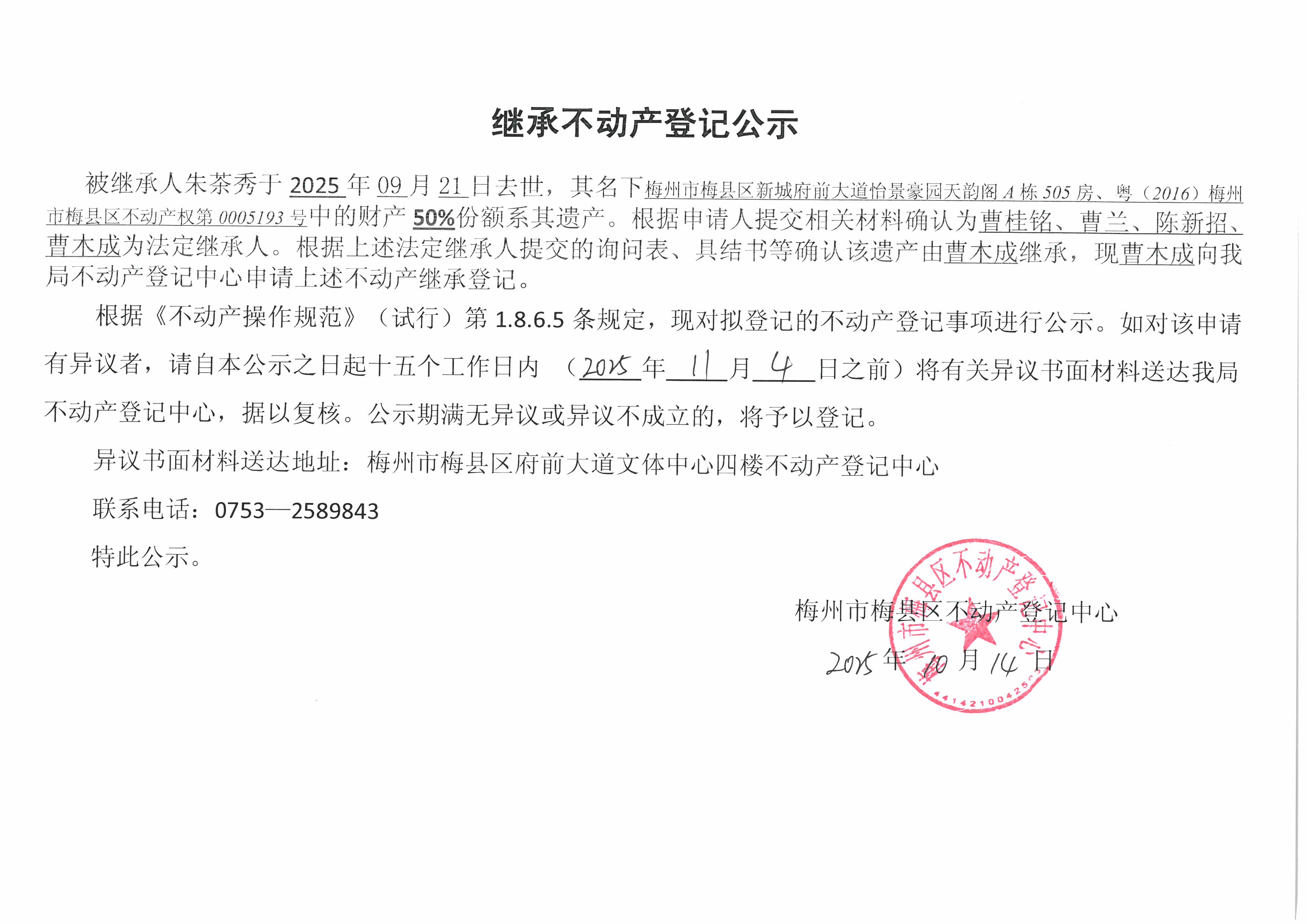 被繼承人朱茶秀于2025年09月21日去世,其名下梅州市梅縣區新城府前大道怡景豪園天韻閣A棟505房、粵(2016)梅州市梅縣區不動產權第0005193號中的財產50%份額系其遺產。根據申請人提交相關材料確認為曹桂銘、曹蘭、陳新招、曹木成為法定繼承人。根據上述法定繼承人提交的詢問表、具結書等確認該遺產由曹木成繼承,現曹木成向我局不動產登記中心申請上述不動產繼承登記。