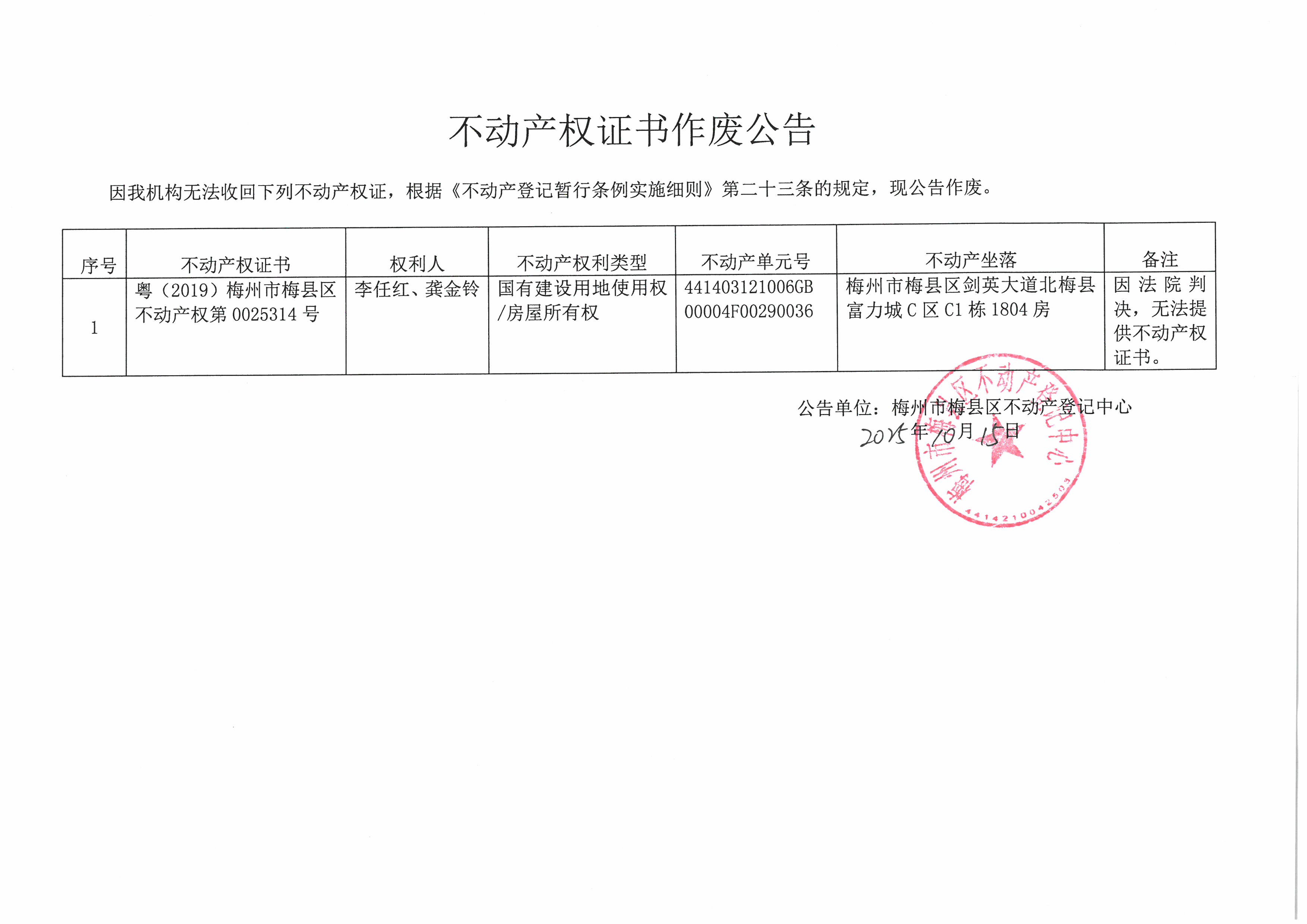 不動產登記中心登記公告(作廢公告-李任紅、龔金鈴-粵(2019)梅州市梅縣區不動產權第0025314號)