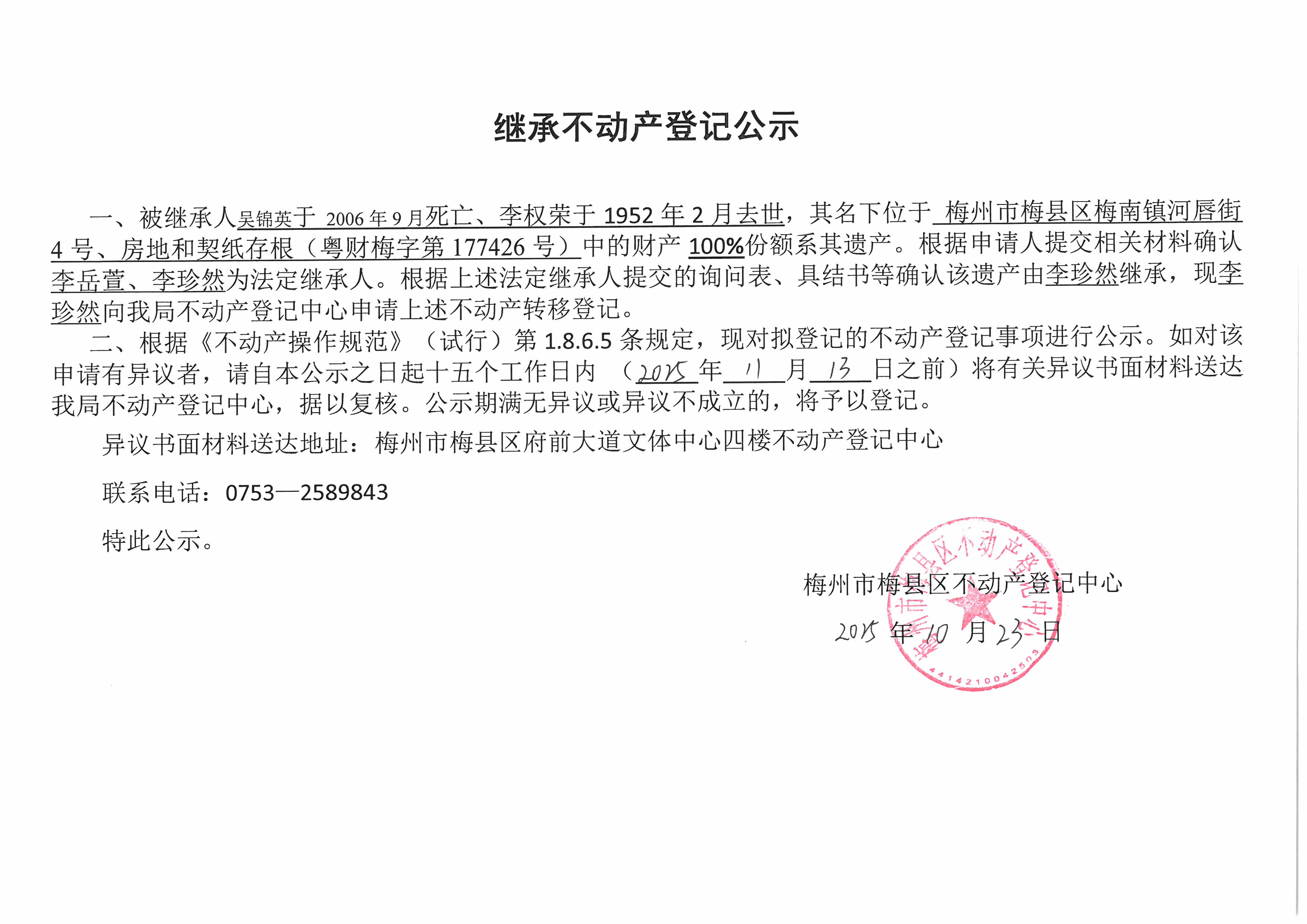 被繼承人吳錦英于2006年9月死亡、李權榮于1952年2月去世,其名下位于梅州市梅縣區梅南鎮河唇街4號、房地和契紙存根(粵財梅字第177426號)中的財產100%份額系其遺產。根據申請人提交相關材料確認李岳萱、李珍然為法定繼承人。根據上述法定繼承人提交的詢問表、具結書等確認該遺產由李珍然繼承,現李珍然向我局不動產登記中心申請上述不動產轉移登記。。