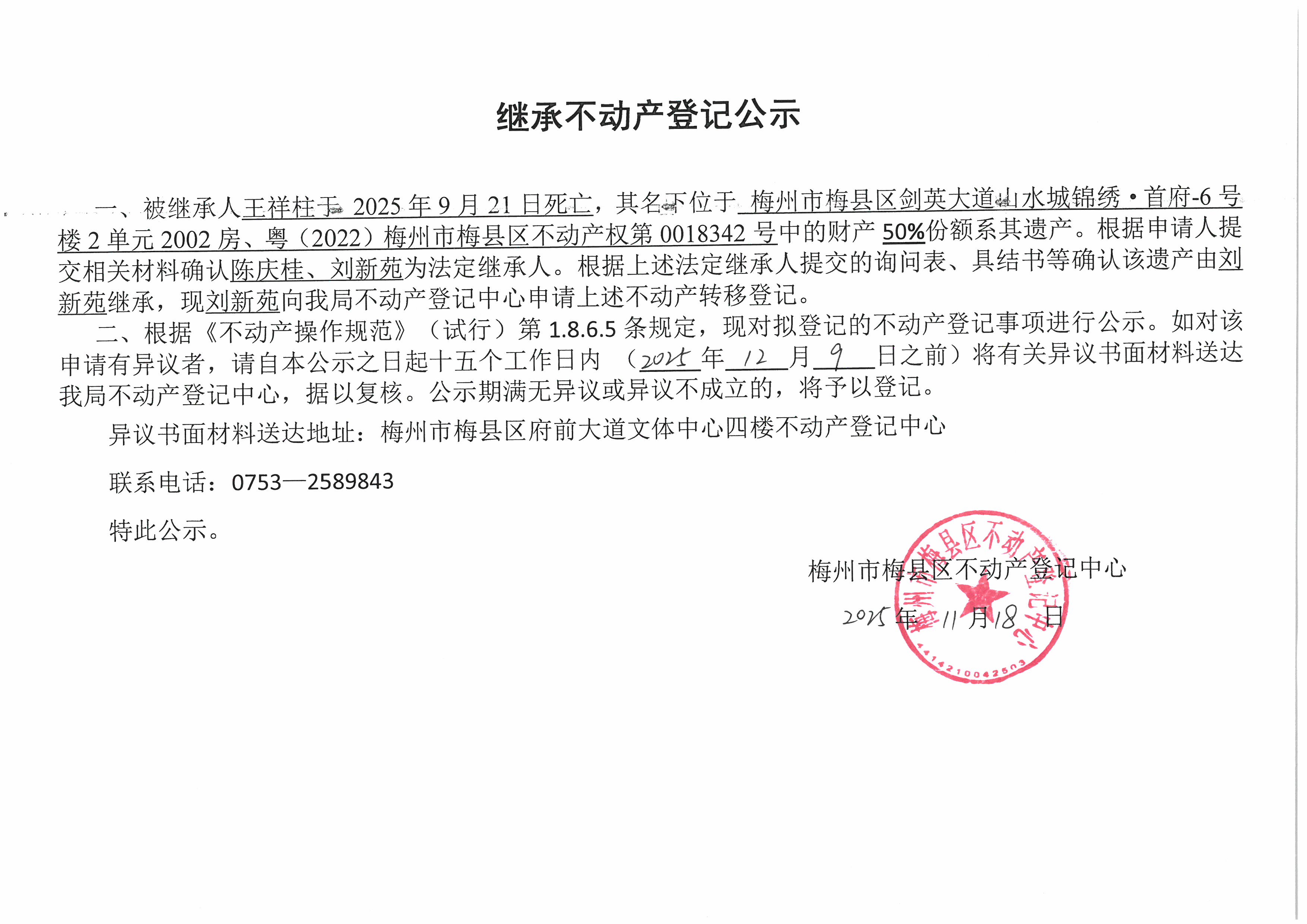 被繼承人王祥柱于 2025年9月21日死亡,其名下位于 梅州市梅縣區劍英大道山水城錦繡·首府-6號樓2單元2002房、粵(2022)梅州市梅縣區不動產權第0018342號中的財產50%份額系其遺產。根據申請人提交相關材料確認陳慶桂、劉新苑為法定繼承人。根據上述法定繼承人提交的詢問表、具結書等確認該遺產由劉新苑繼承,現劉新苑向我局不動產登記中心申請上述不動產轉移登記。