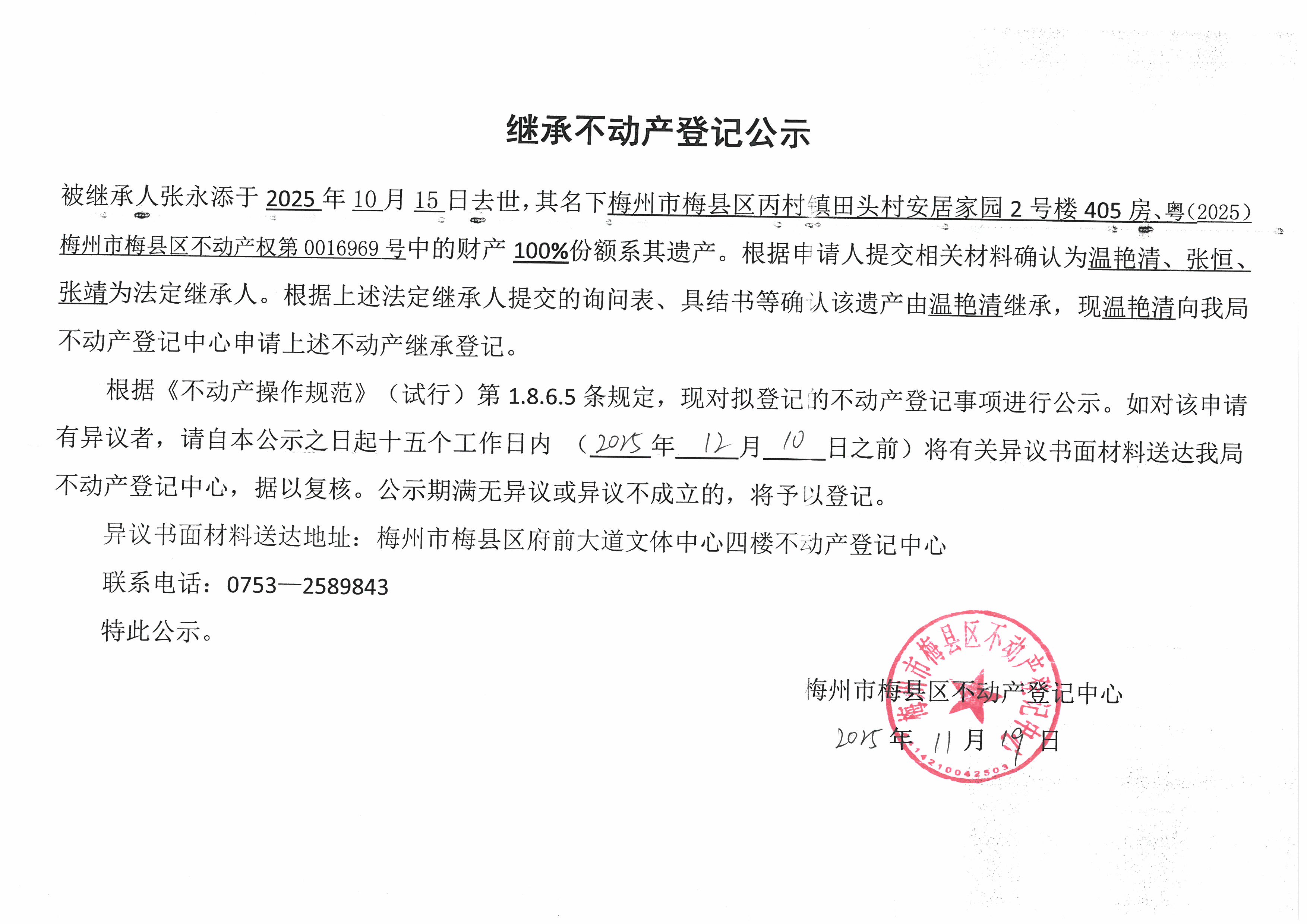 被繼承人張永添于2025年10月15日去世,其名下梅州市梅縣區丙村鎮田頭村安居家園2號樓405房、粵(2025)梅州市梅縣區不動產權第0016969號中的財產100%份額系其遺產。根據申請人提交相關材料確認為溫艷清、張恒、張靖為法定繼承人。根據上述法定繼承人提交的詢問表、具結書等確認該遺產由溫艷清繼承,現溫艷清向我局不動產登記中心申請上述不動產繼承登記。