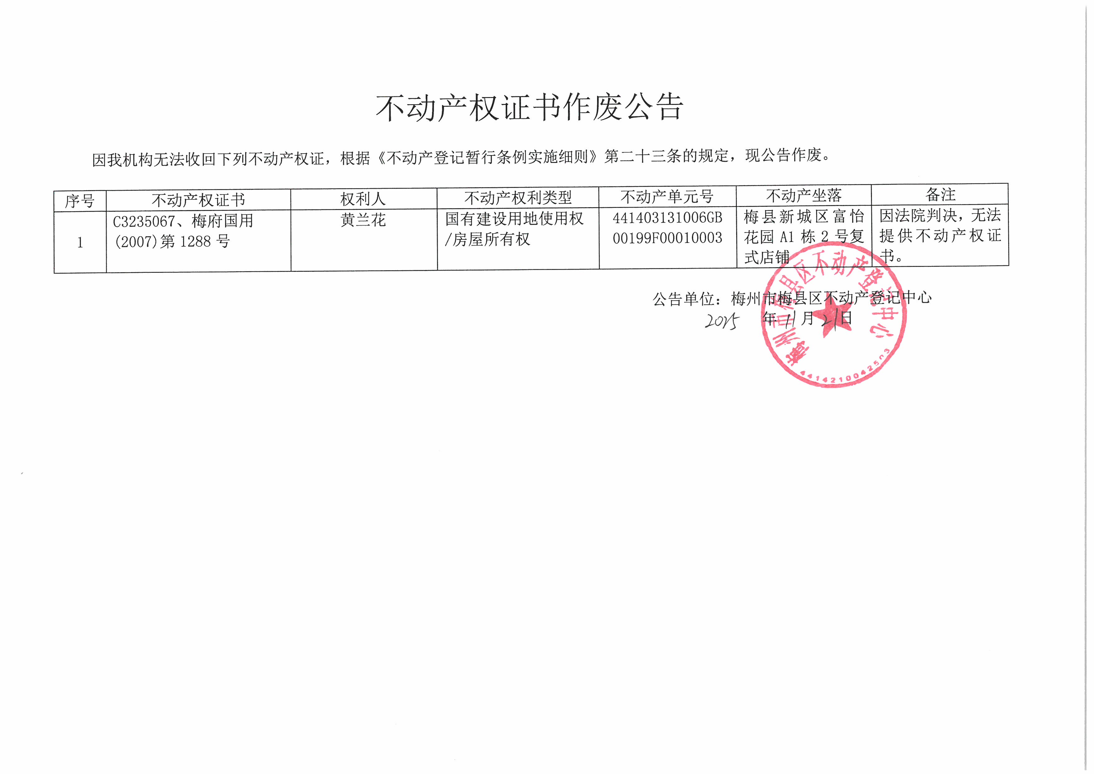 不動產登記中心登記公告(作廢公告-黃蘭花-C3235067、梅府國用(2007)第1288號)