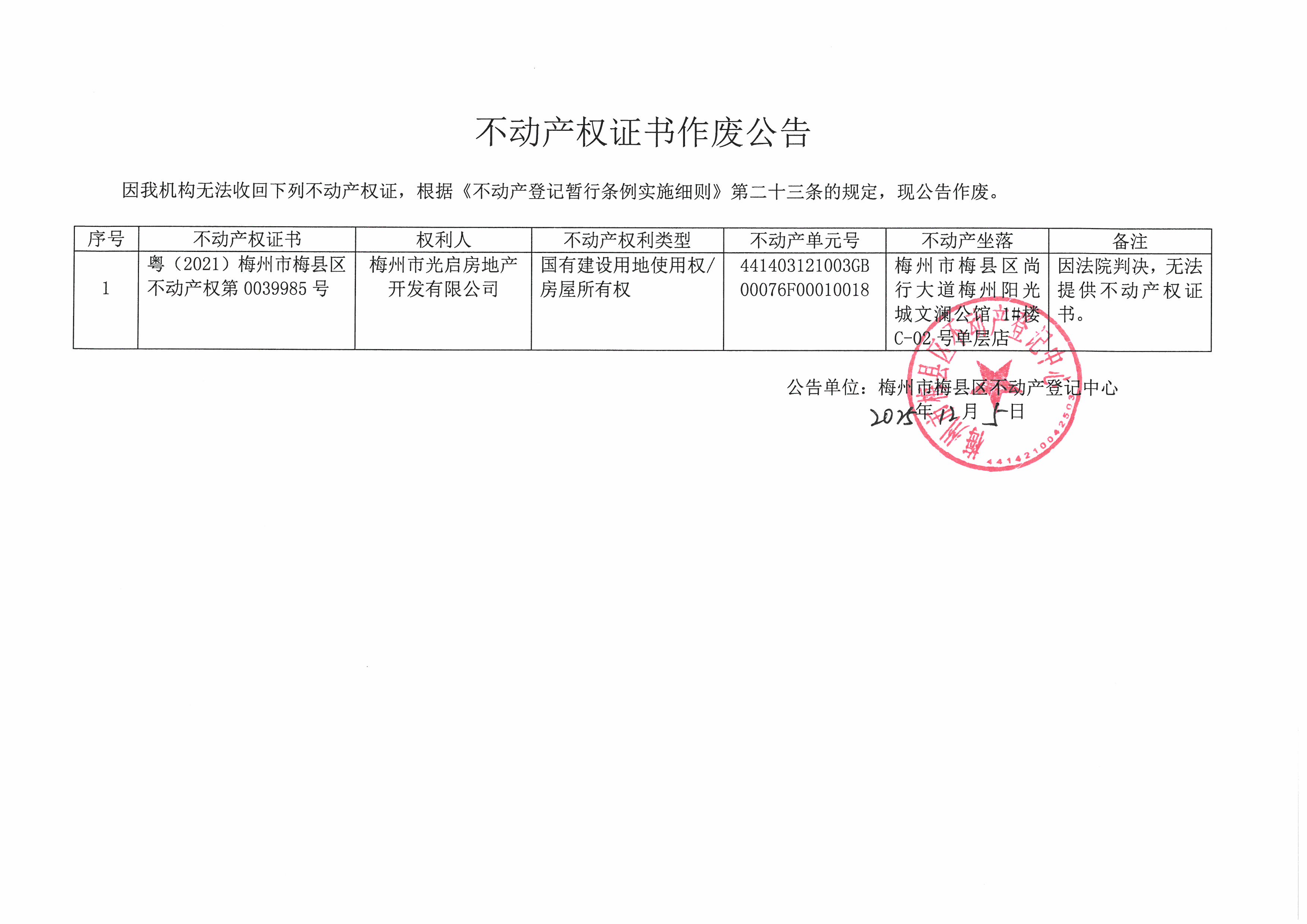 不動產登記中心登記公告(作廢公告-梅州市光啟房地產開發有限公司-粵(2021)梅州市梅縣區不動產權第0039985號)