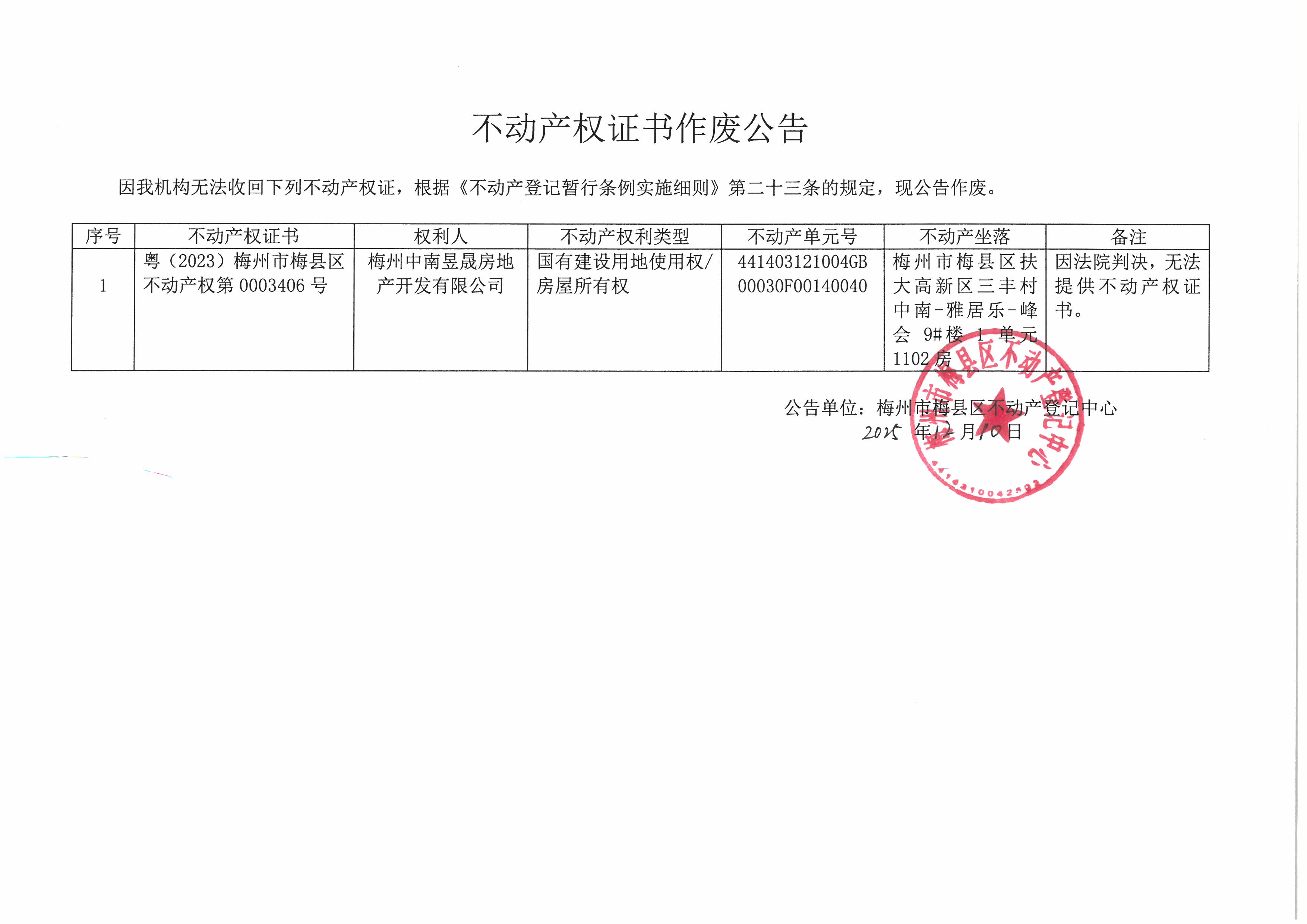 不動產登記中心登記公告(作廢公告-梅州中南昱晟房地產開發有限公司-粵(2023)梅州市梅縣區不動產權第0003406號)