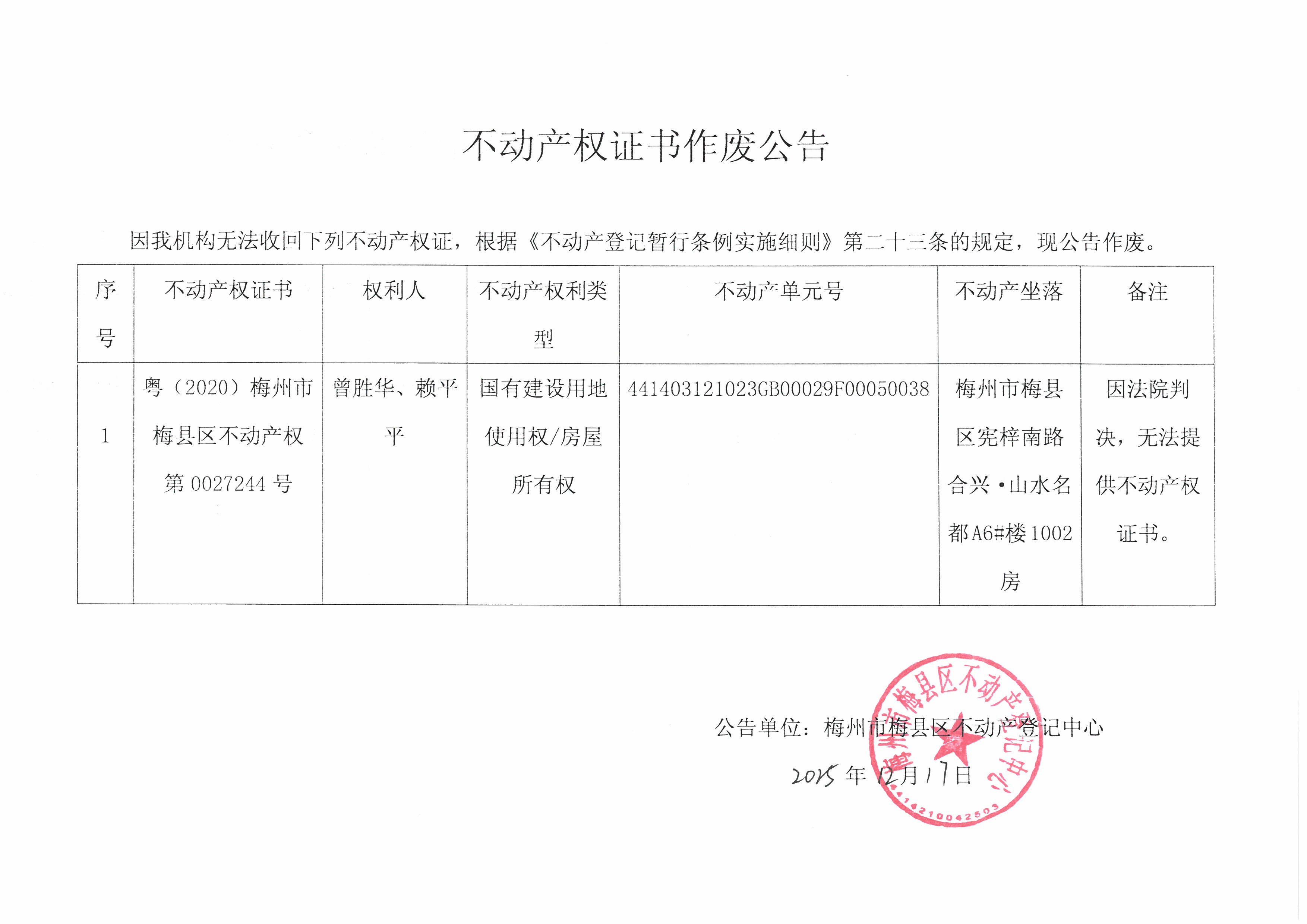 不動產(chǎn)登記中心登記公告(作廢公告-曾勝華、賴平平-粵(2020)梅州市梅縣區(qū)不動產(chǎn)權第0027244號)