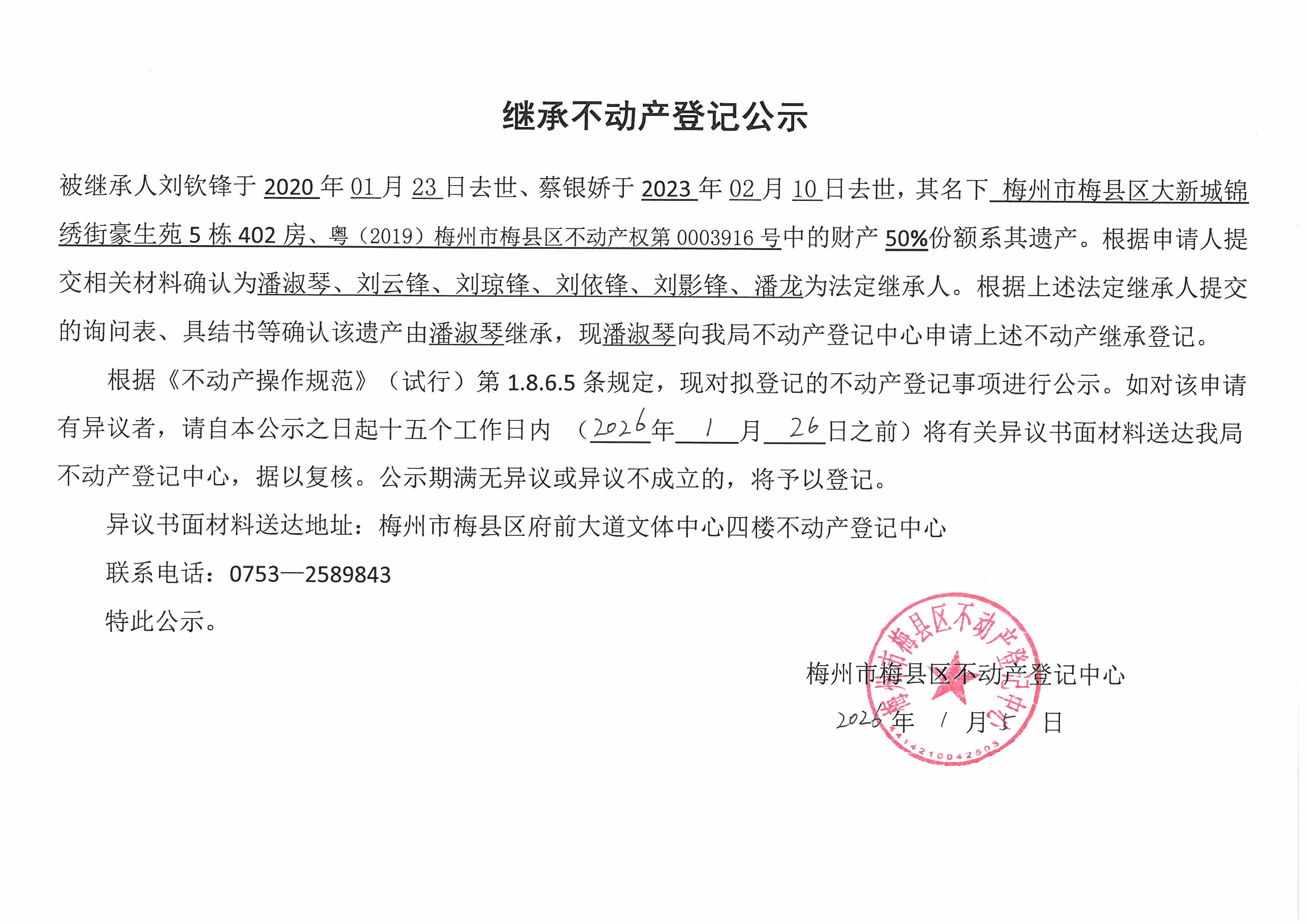 被繼承人劉欽鋒于2020年01月23日去世、蔡銀嬌于2023年2月10日去世,其名下梅州市梅縣區(qū)大新城錦繡街豪生苑5棟402房、粵(2019)梅州市梅縣區(qū)不動(dòng)產(chǎn)權(quán)第0003916號(hào)的財(cái)產(chǎn)50%份額系其遺產(chǎn)。根據(jù)申請(qǐng)人提交相關(guān)材料確認(rèn)為潘淑琴、劉云鋒、劉瓊鋒、劉依鋒、劉影鋒、潘龍為法定繼承人。根據(jù)上述法定繼承人提交的詢問(wèn)表、具結(jié)書(shū)等確認(rèn)該遺產(chǎn)由潘淑琴繼承,現(xiàn)潘淑琴向我局不動(dòng)產(chǎn)登記中心申請(qǐng)上述不動(dòng)產(chǎn)轉(zhuǎn)移登記。