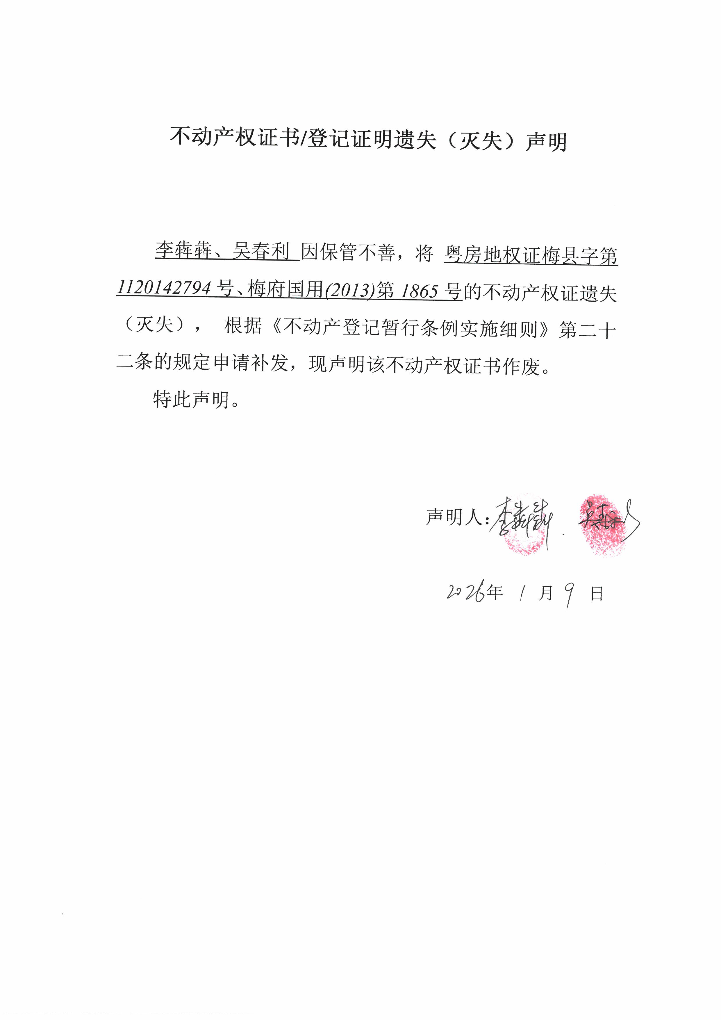 李犇犇、吳春利因保管不善,將粵房地權證梅縣字第1120142794號、梅府國用(2013)第1865號的不動產權證遺失(滅失),根據《不動產登記暫行條例實施細則》第二十二條的規定申請補發,現聲明該不動產權證書作廢。