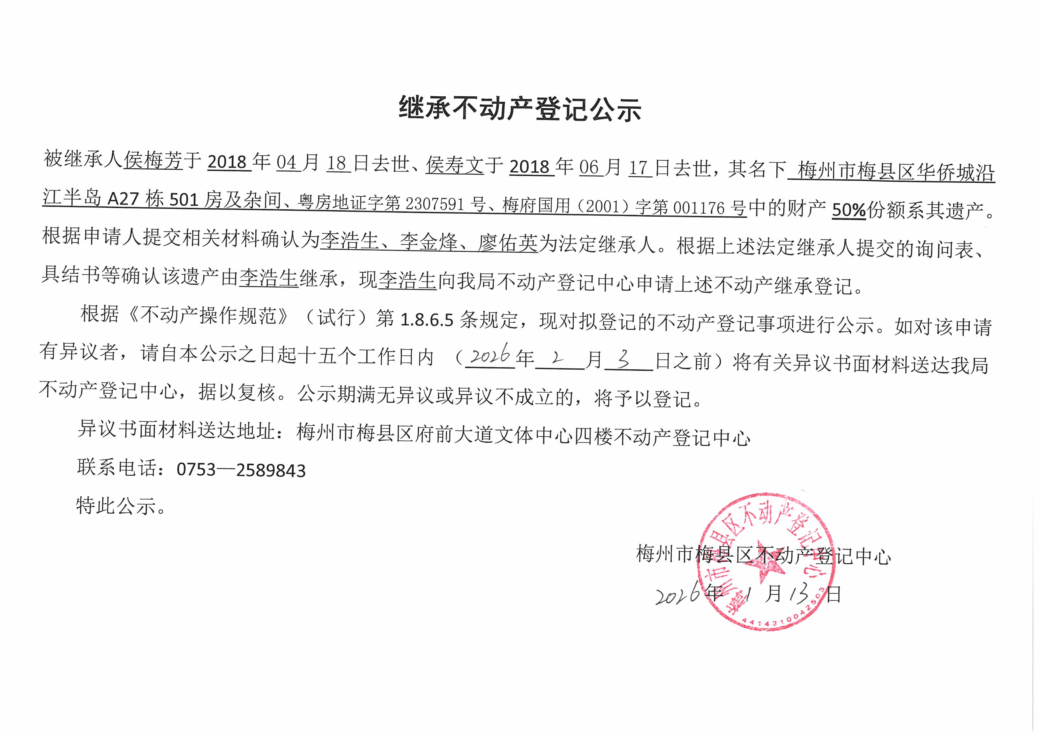 被繼承人侯梅芳于2018年04月18日去世、侯壽文于2018年06月17日去世,其名下梅州市梅縣區華僑城沿江半島A27棟501房及雜間、粵房地證字第2307591號、梅府國用(2001)字第001176號中的財產50%份額系其遺產根據申請人提交相關材料確認為李浩生、李金烽、廖佑英為法定繼承人。根據上述法定繼承人提交的詢問表,具結書等確認該遺產由李浩生繼承,現李浩生向我局不動產登記中心申請上述不動產繼承登記。
