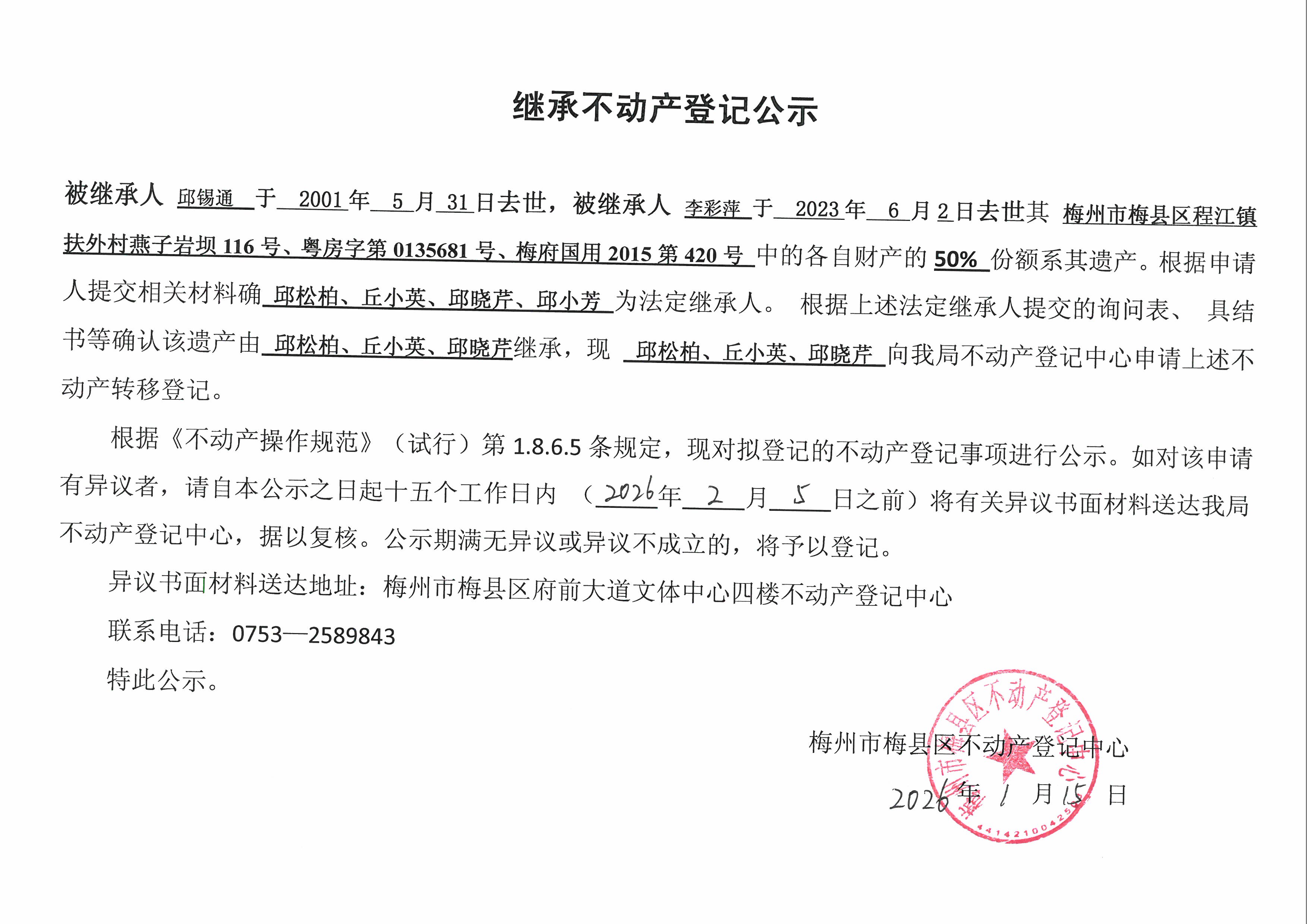 被繼承人邱錫通于2001年5月31日去世,被繼承人李彩萍于2023年6月2日去世其梅州市梅縣區(qū)程江鎮(zhèn)扶外村燕子巖壩116號、粵房字第0135681號、梅府國用2015第420號中的各自財(cái)產(chǎn)的50%份額系其遺產(chǎn)。根據(jù)申請人提交相關(guān)材料確邱松柏、丘小英、邱曉芹、邱小芳為法定繼承人。根據(jù)上述法定繼承人提交的詢問表、具結(jié)書等確認(rèn)該遺產(chǎn)由邱松柏、丘小英、邱曉芹繼承,現(xiàn)邱松柏、丘小英、邱曉芹向我局不動產(chǎn)登記中心申請上述不動產(chǎn)轉(zhuǎn)移登記。