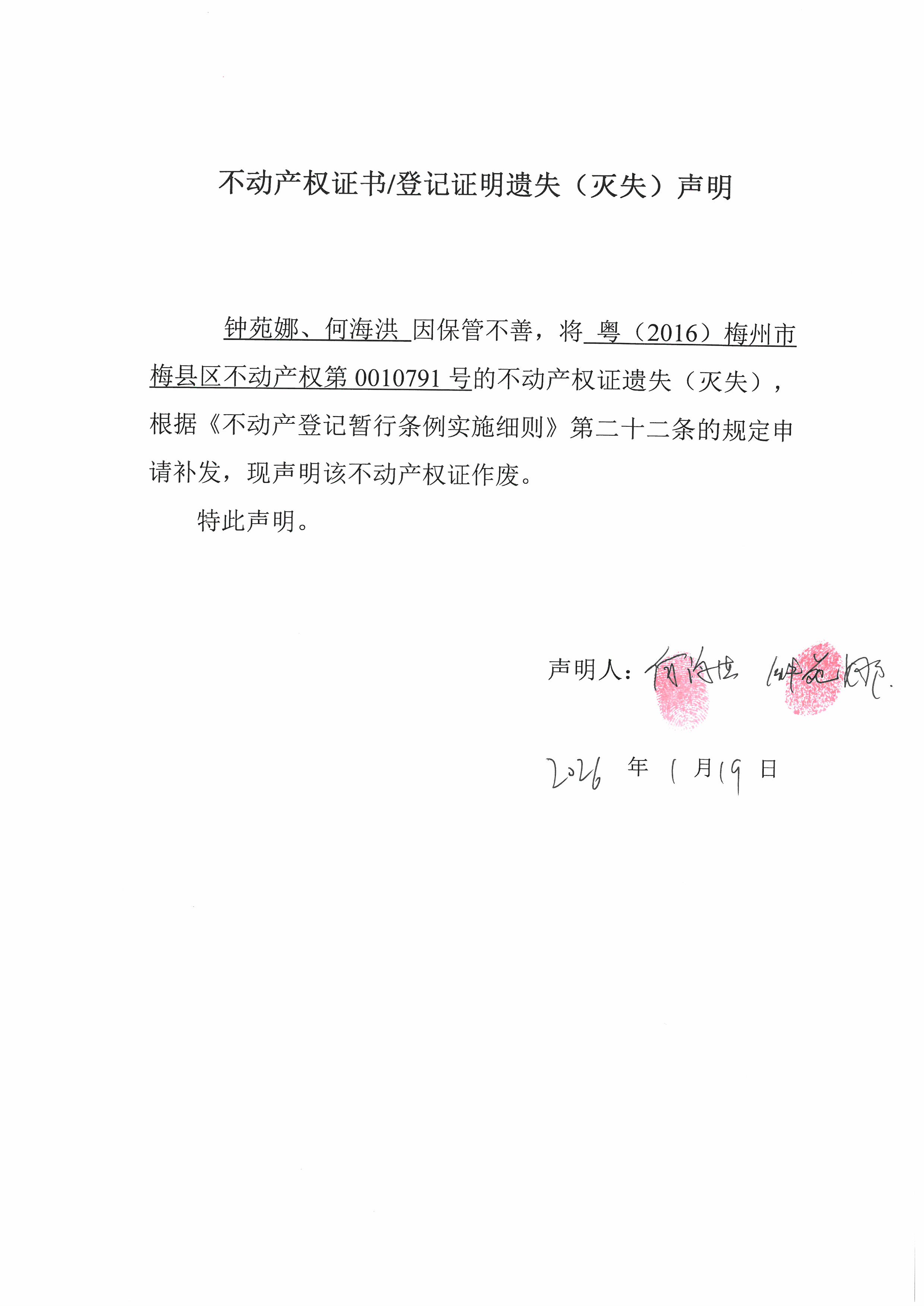 鐘苑娜、何海洪因保管不善,將粵(2016)梅州市梅縣區不動產權第0010791號的不動產權證遺失(滅失)根據《不動產登記暫行條例實施細則》第二十二條的規定申請補發,現聲明該不動產權證作廢。