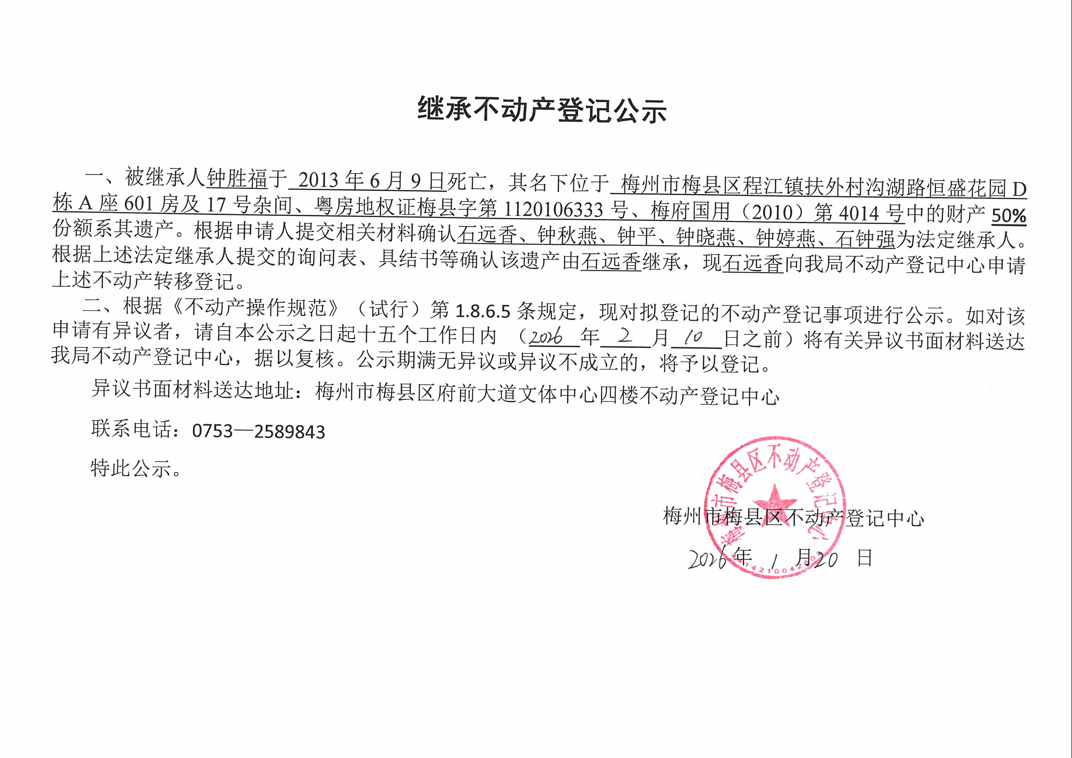 被繼承人鐘勝福于2013年6月9日死亡,其名下位于梅州市梅縣區程江鎮扶外村溝湖路恒盛花園D棟A座601房及17號雜間、粵房地權證梅縣字第1120106333號、梅府國用(2010)第4014號中的財產50%份額系其遺產。根據申請人提交相關材料確認石遠香、鐘秋燕、鐘平、鐘曉燕、鐘婷燕、石鐘強為法定繼承人。根據上述法定繼承人提交的詢問表、具結書等確認該遺產由石遠香繼承,現石遠香向我局不動產登記中心申請上述不動產轉移登記。