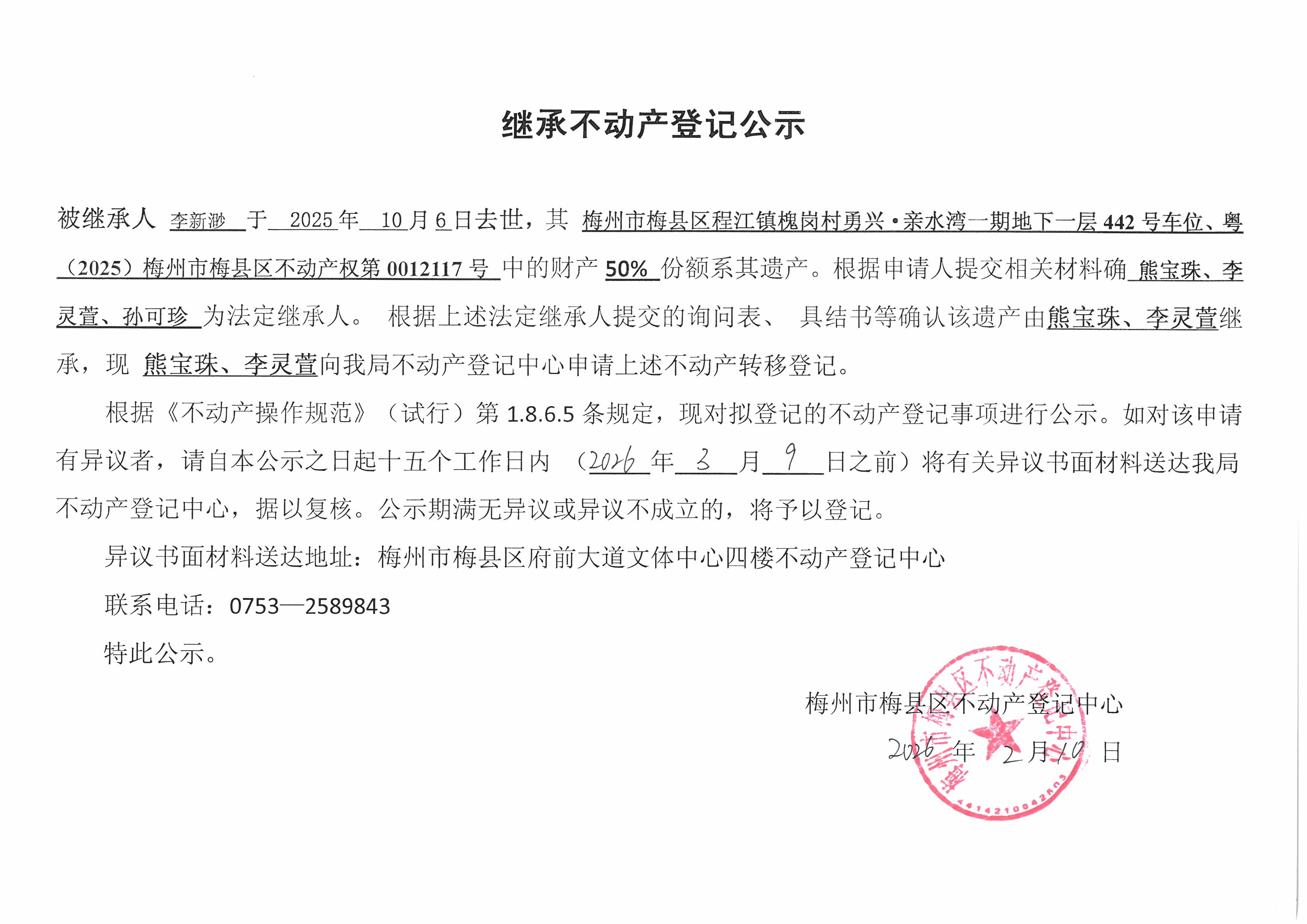被繼承人李新渺于2025年10月6日去世,其梅州市梅縣區程江鎮槐崗村勇興·親水灣一期地下一層442號車位、粵(2025)梅州市梅縣區不動產權第0012117號中的財產50%份額系其遺產。根據申請人提交相關材料確認熊寶珠、李靈萱、孫可珍為法定繼承人。根據上述法定繼承人提交的詢問表、具結書等確認該遺產由熊寶珠、李靈萱繼承,現熊寶珠、李靈萱向我局不動產登記中心申請上述不動產轉移登記。