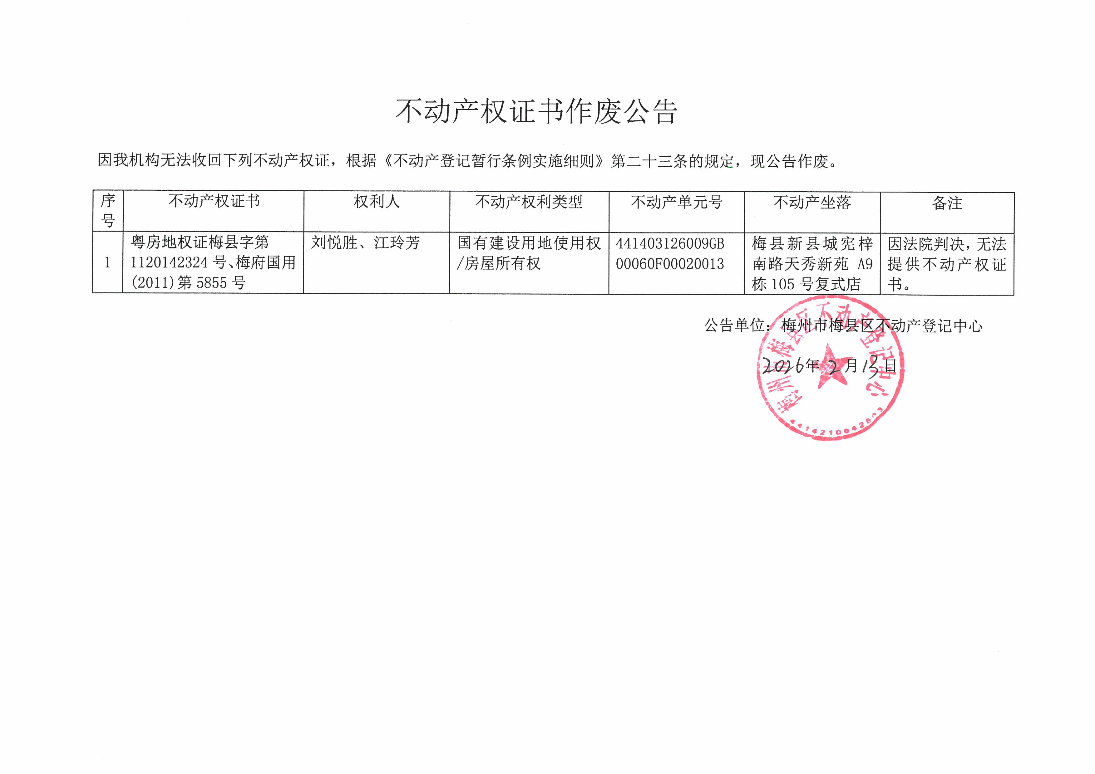 不動產登記中心登記公告(作廢公告-劉悅勝、江玲芳-粵房地權證梅縣字第1120142324號、梅府國用(2011)第5855號)