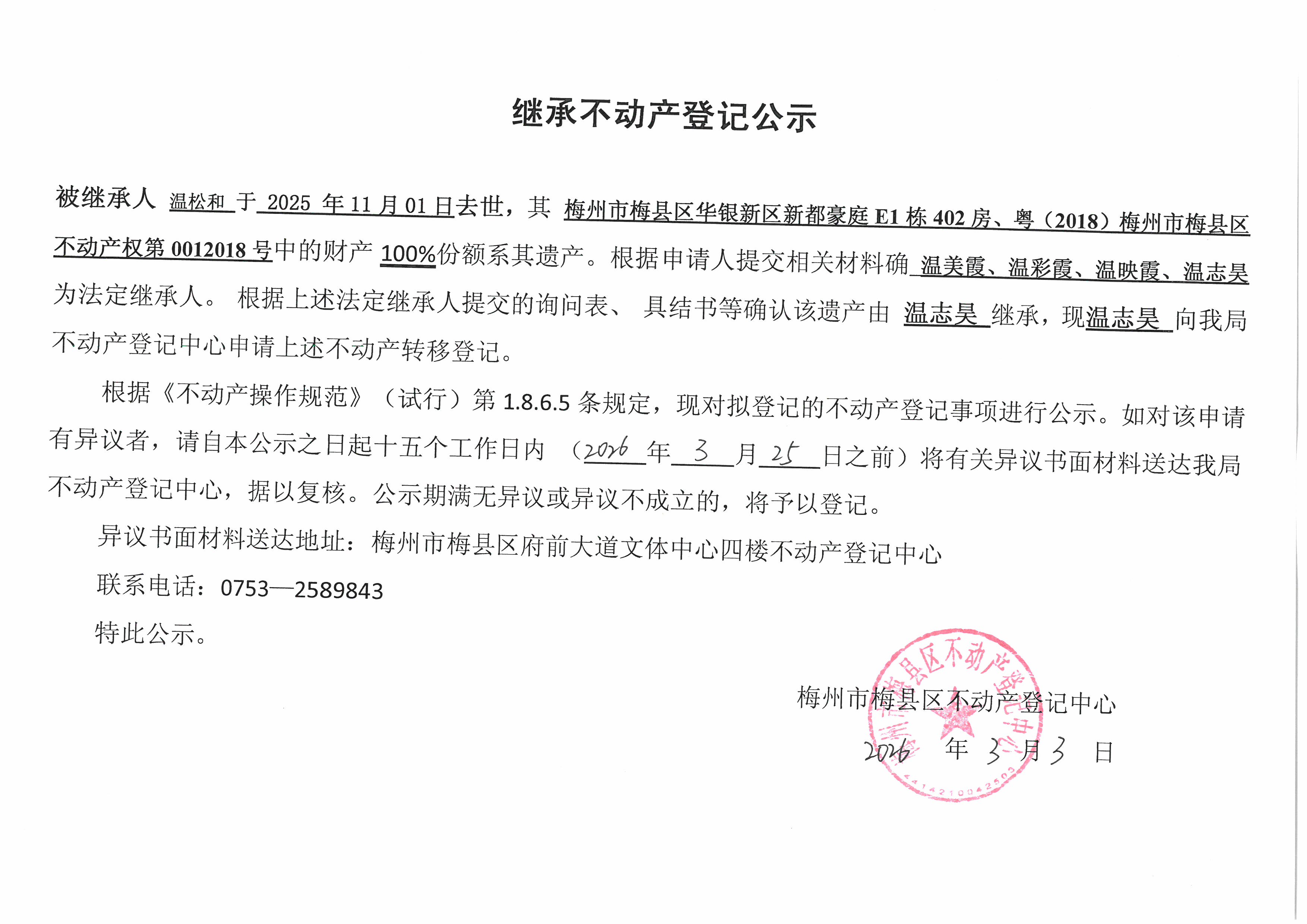 被繼承人溫松和于2025年11月01日去世,其梅州市梅縣區華銀新區新都豪庭E1棟402房、粵(2018)梅州市梅縣區不動產權第0012018號中的財產100%份額系其遺產。根據申請人提交相關材料確認溫美霞、溫彩霞、溫映霞、溫志昊為法定繼承人。根據上述法定繼承人提交的詢問表、具結書等確認該遺產由溫志昊繼承,現溫志吳向我局不動產登記中心申請上述不動產轉移登記。