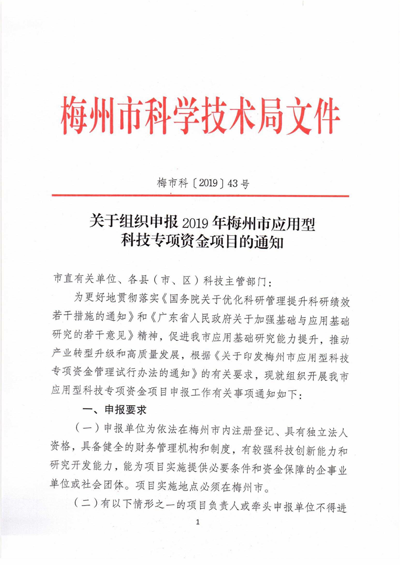 關(guān)于組織申報(bào)2019年梅州市應(yīng)用型科技專(zhuān)項(xiàng)資金項(xiàng)目的通知
