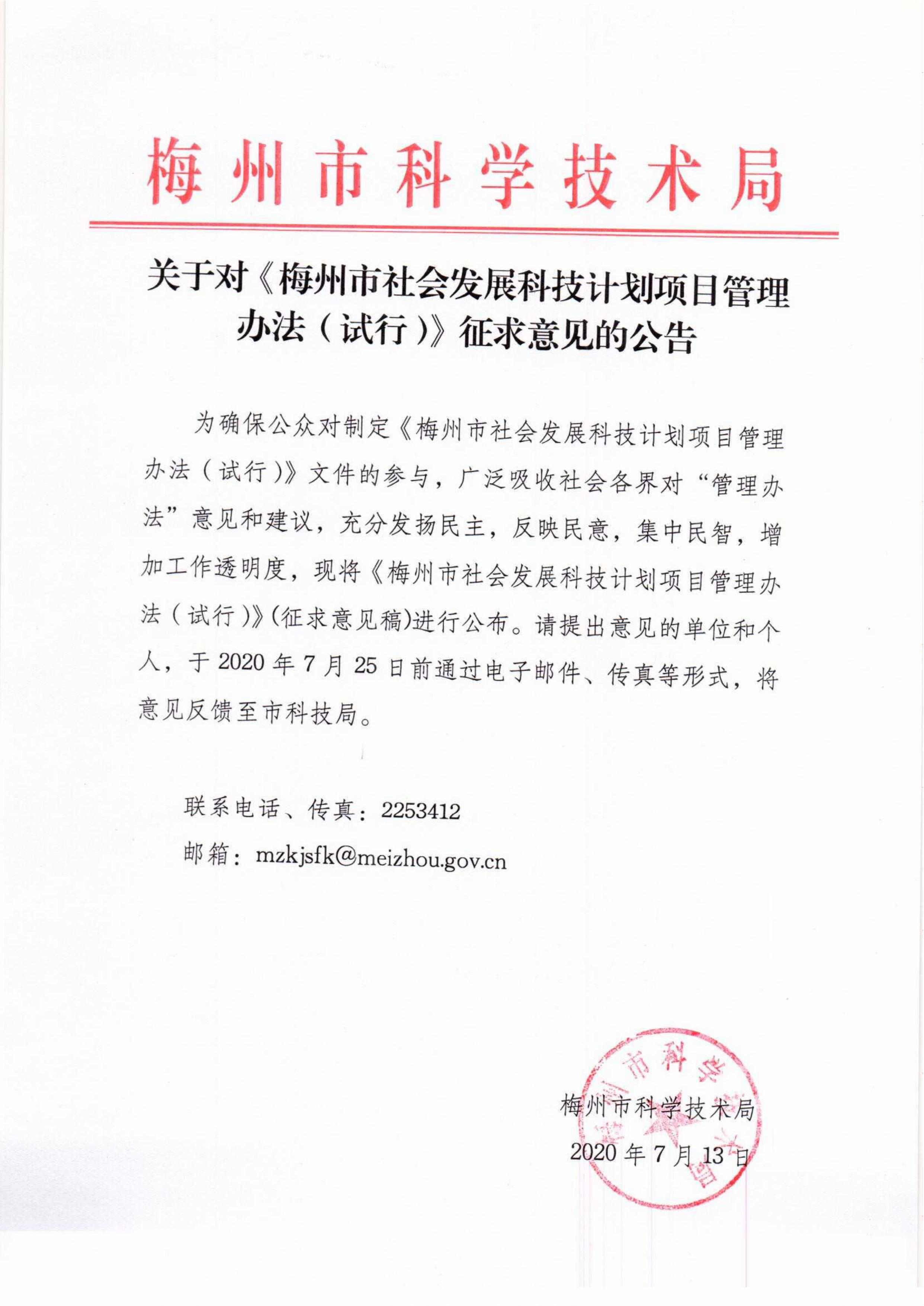 關于對《梅州市社會發展科技計劃項目管理辦法(試行)》征求意見的公告