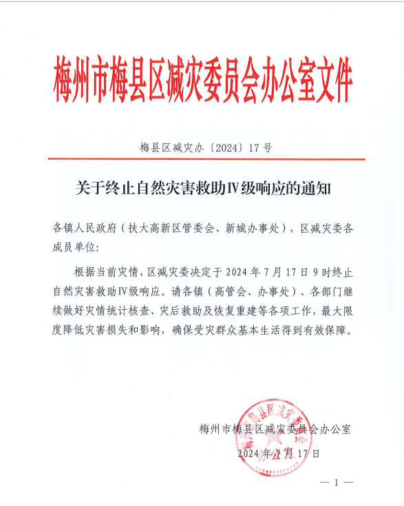 根據當前災情,區減災委決定于2024年7月17日9時終止自然災害救助Ⅳ級響應。
